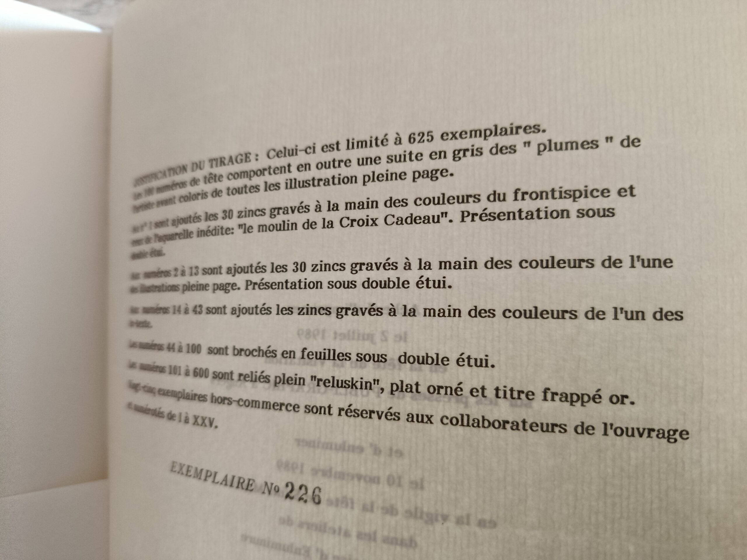 In-folio cartonné avec reliure plein ‘reluskin’ , plat orné et titre frappé ‘or’ . jaquette illustrée. Reprise de l’édition originale de 1944. réédition de 1989 épuisée. Ed. n°226 /600
