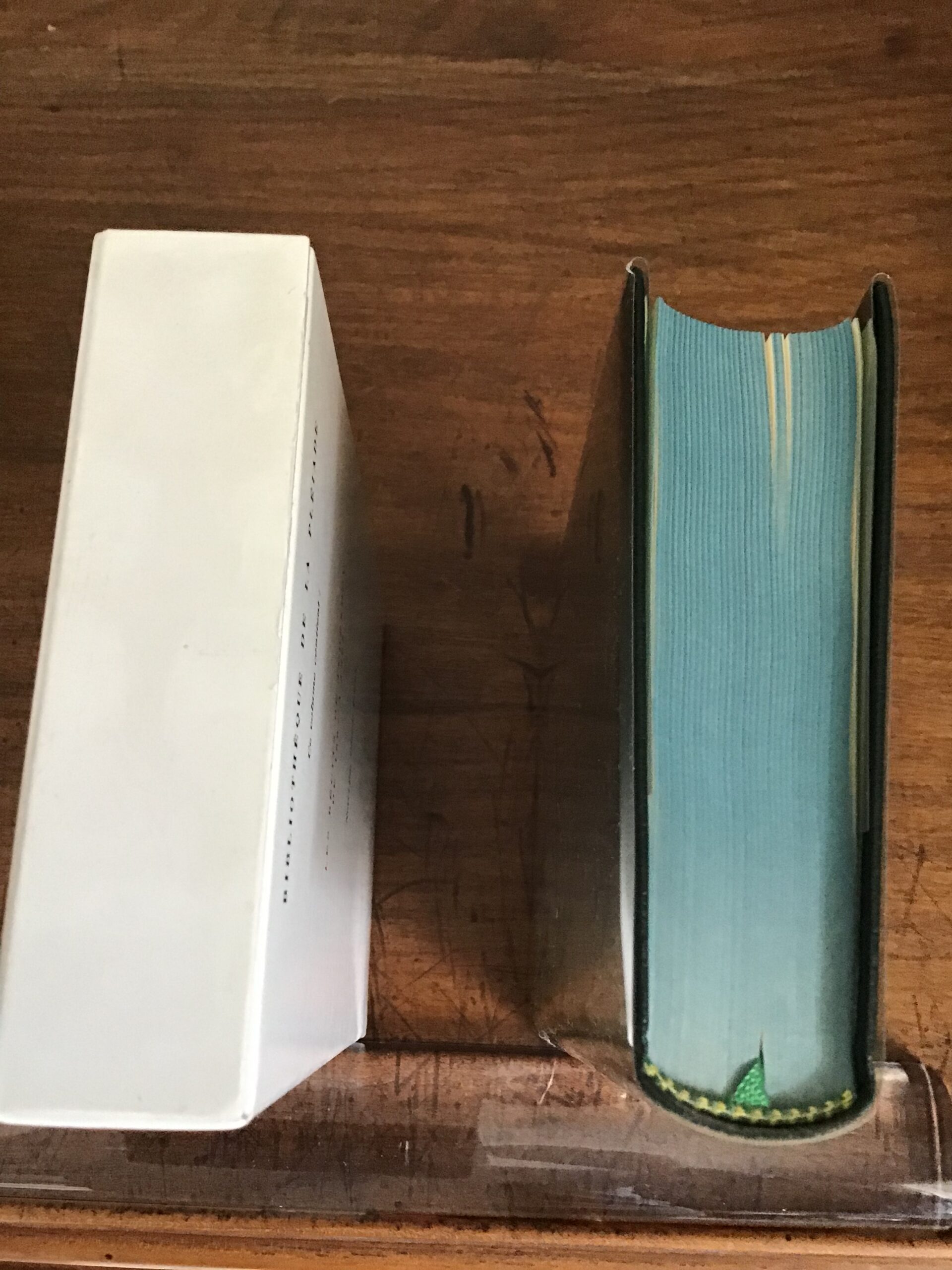 Ouvrage relié en pleine peau dorée à l’or fin 23 carats, imprimé sur papier bible, 2 signets, Rhodoïd, bel emboîtage
