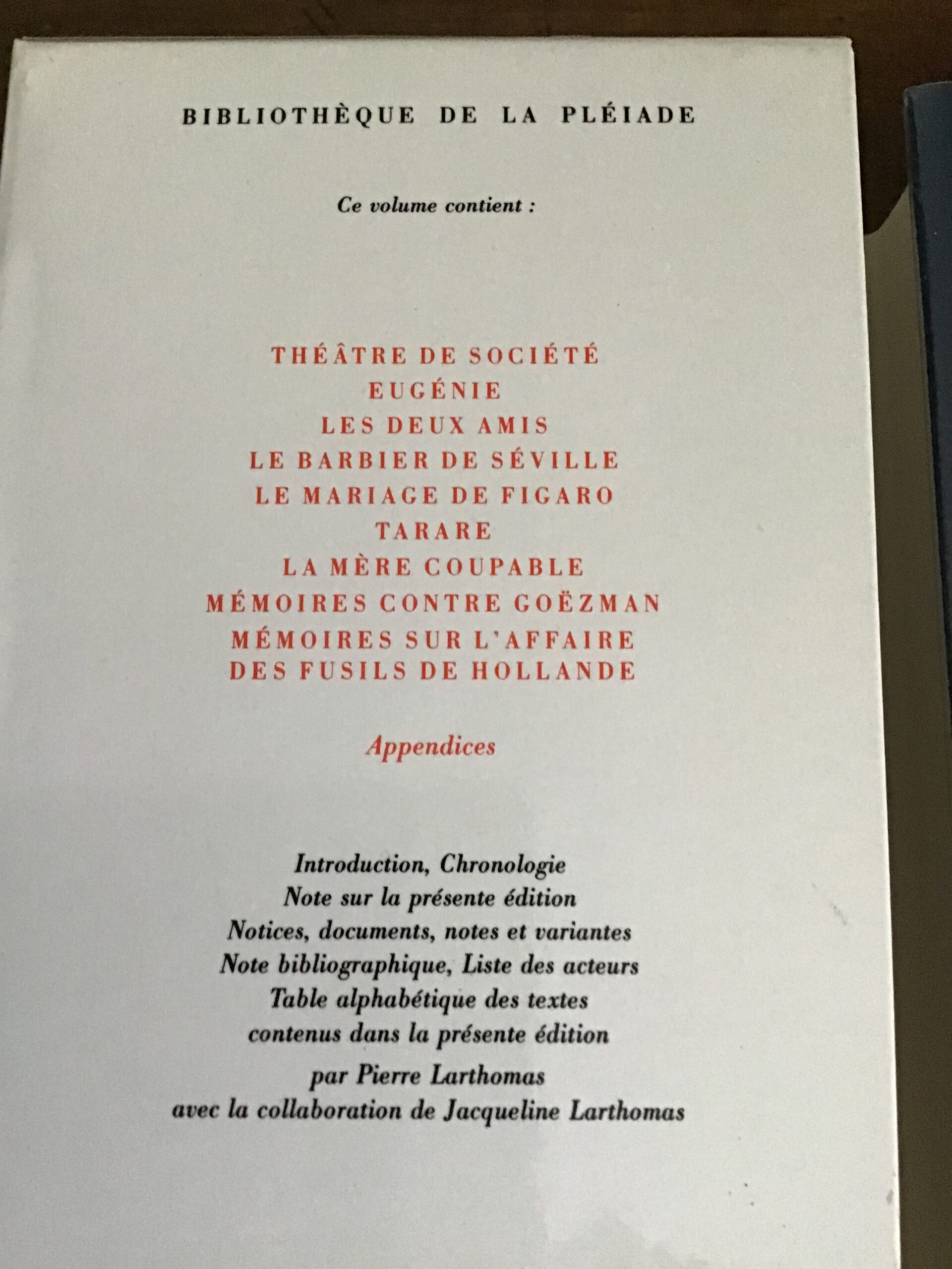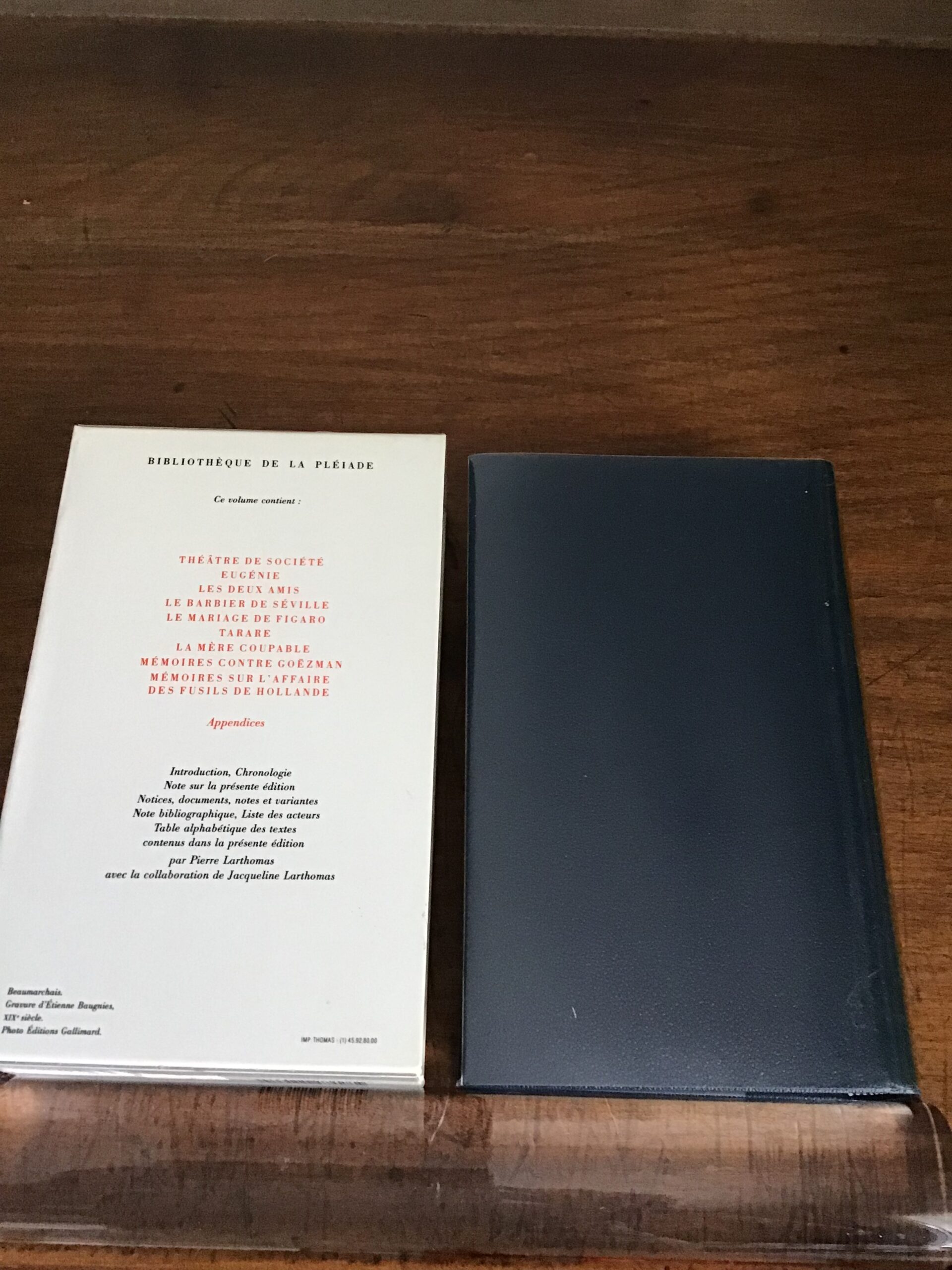 BEAUMARCHAIS/ Oeuvres/ nouvelle édition établie par Pierre LARTHOMAS avec la collaboration de Jacqueline LARTHOMAS/ Volume 22 de la « Bibliothèque de la Pléiade »/ Éditions NRF GALLIMARD/ édition de 1988, impression de 1988.