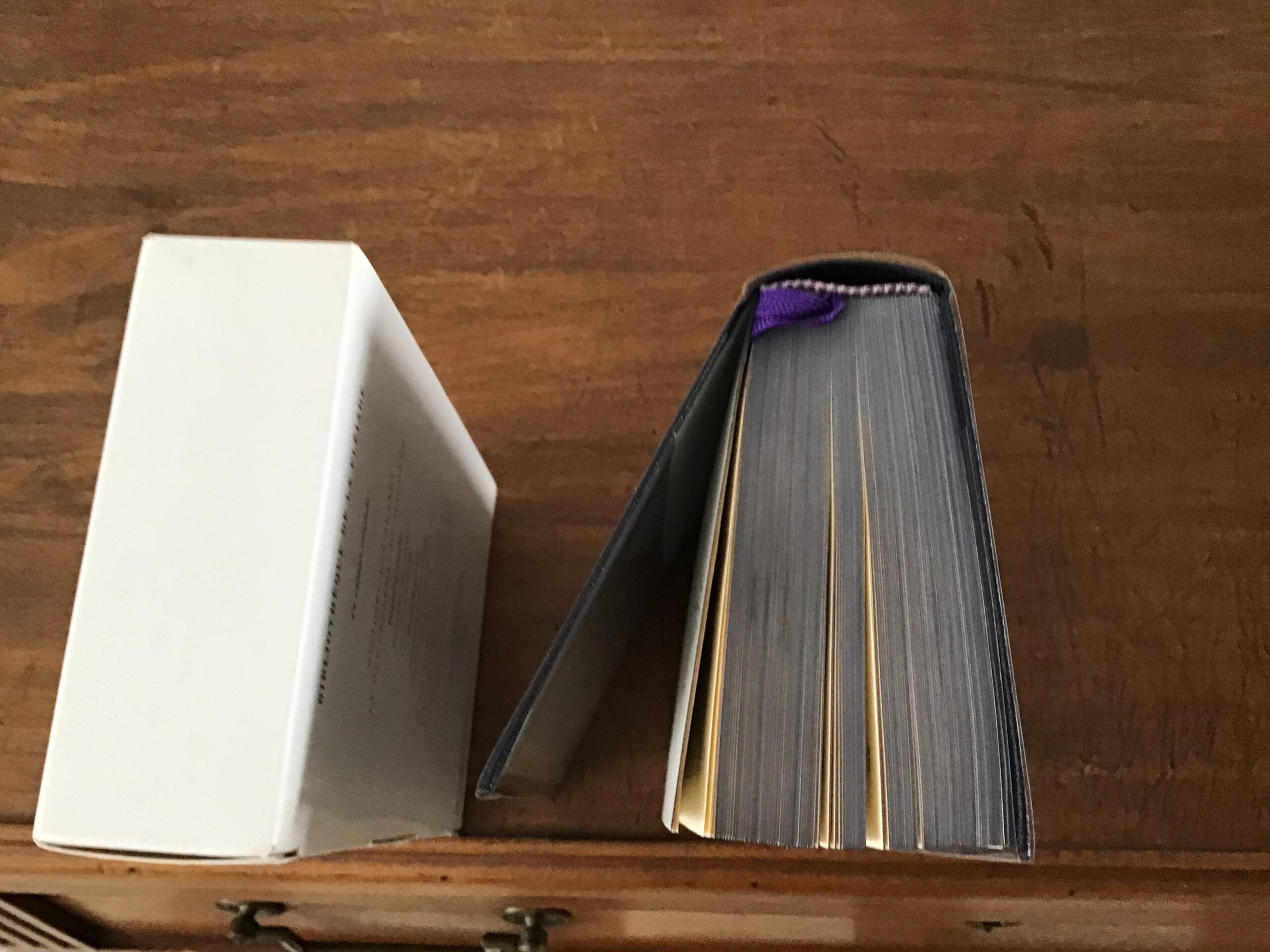 Ouvrage relié en pleine peau dorée à l’or fin 23 carats, imprimé sur papier bible, 2 signets, Rhodoïd, bel emboîtage