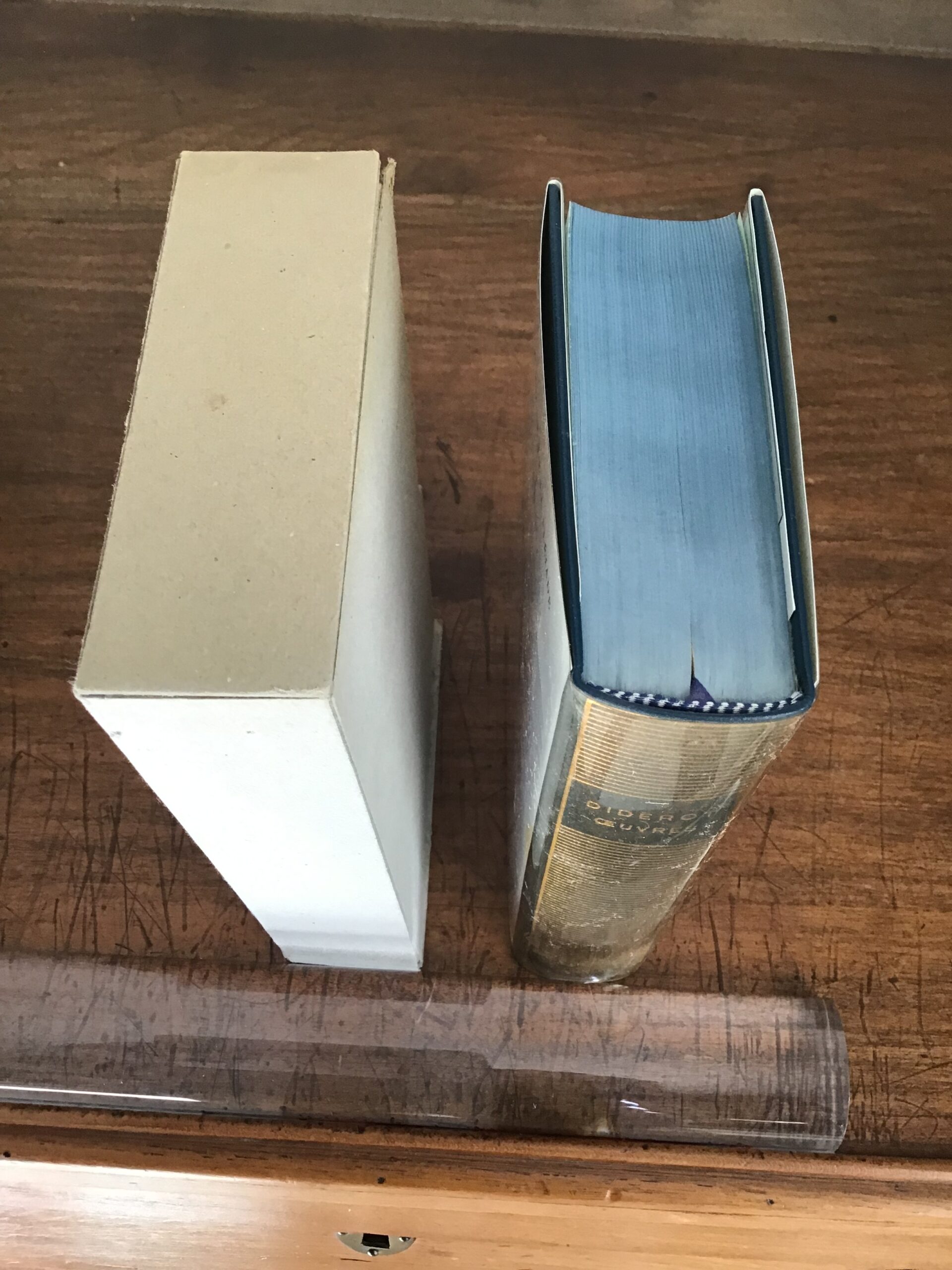 Ouvrage relié en pleine peau dorée à l’or fin 23 carats, imprimé sur papier bible, 2 signets, Rhodoïd, emboîtage en carton brut gris (détérioré)