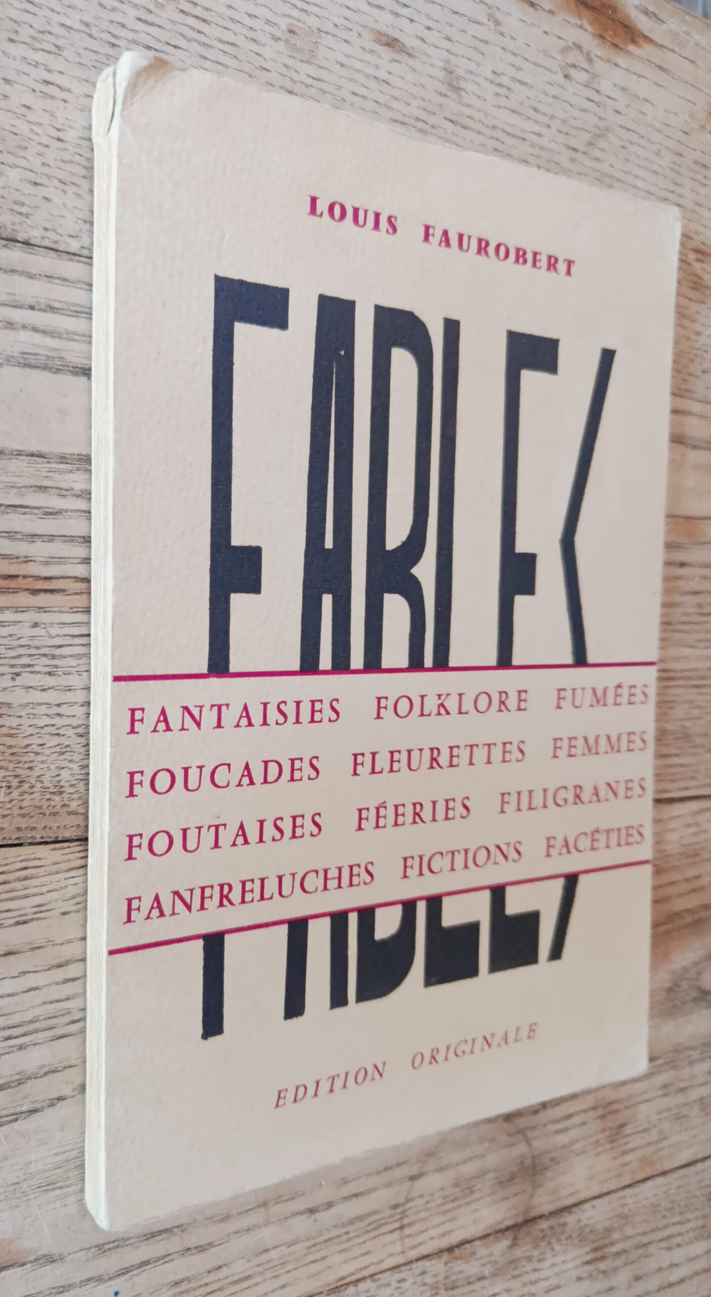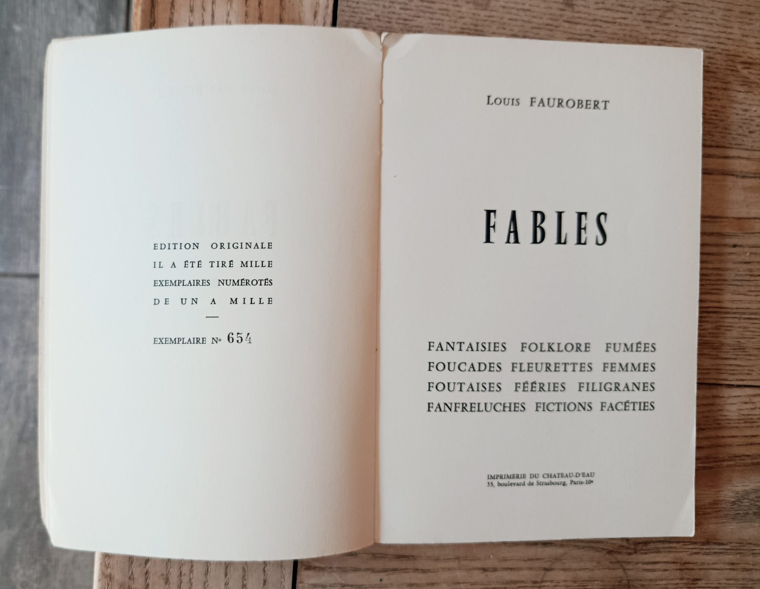 sd, imprimerie du chateau d’eau, édition originale, in-8 broché de 120 pages, exemplaire n°654/1000. Folklore, fantaisies, fumées, foucades, fleurettes, femmes, foutaises, fééries, filigranes, fanfreluches, fictions, facéties.