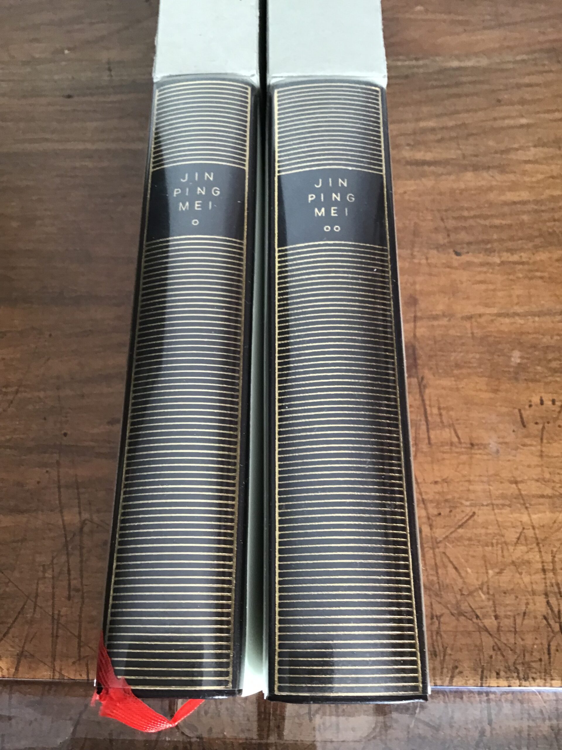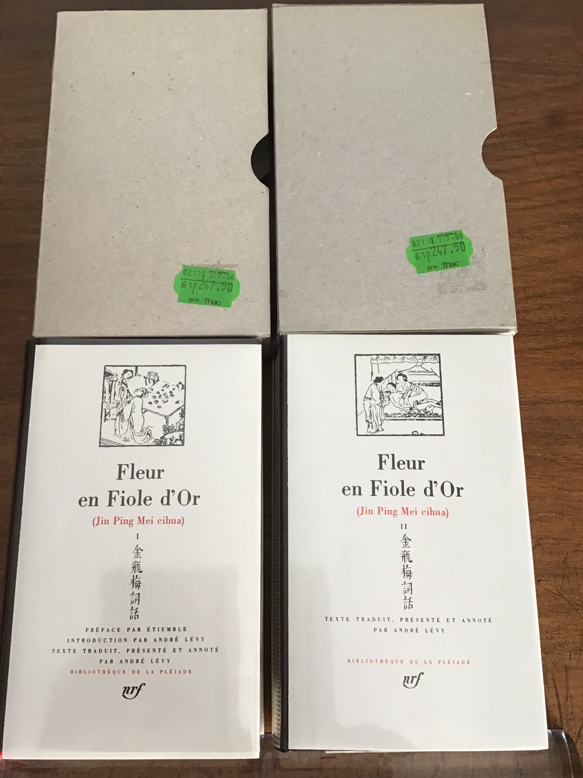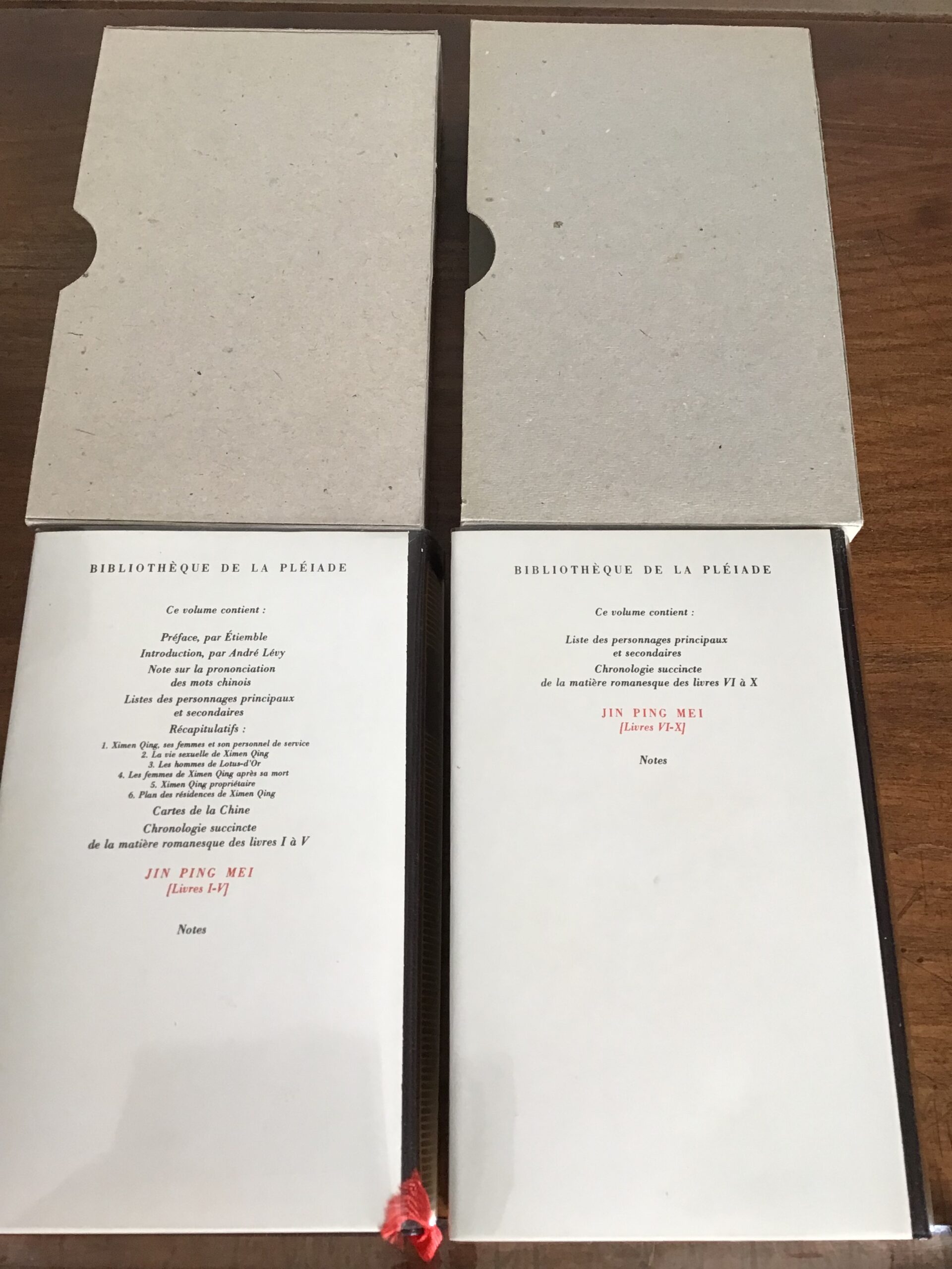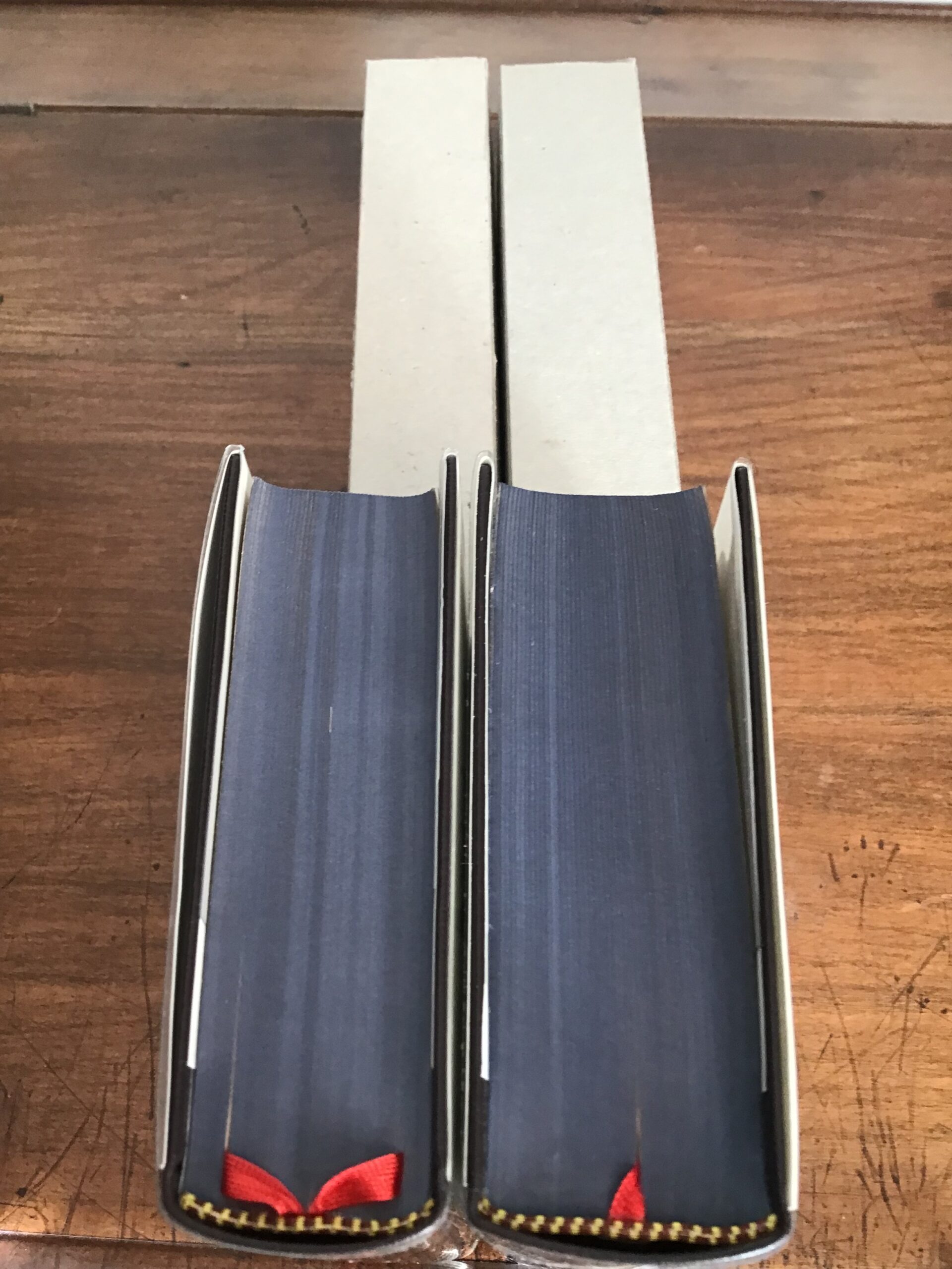 Ouvrages reliés en pleine peau dorée à l’or fin 23 carats, imprimés sur papier bible, 2 signets, Rhodoïd, chacun des 2 tomes sous emboîtage en carton brut gris.