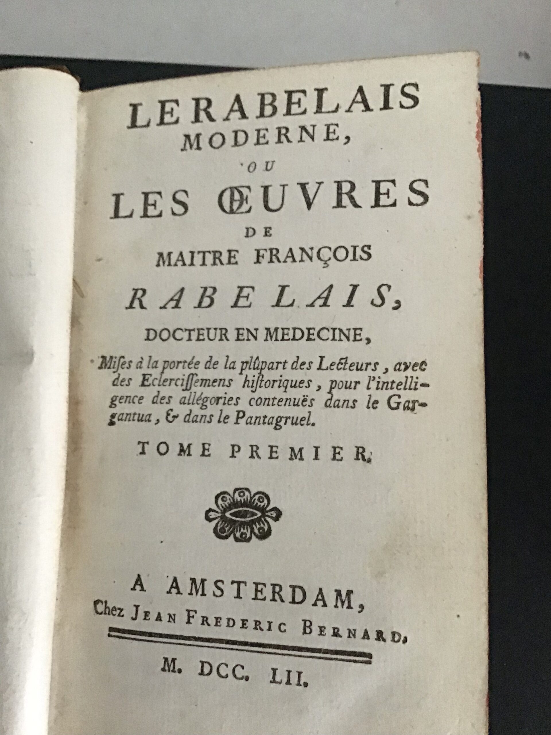 François RABELAIS/ Le RABELAIS moderne/ ou « Les Œuvres de Maître François RABELAIS, Docteur en médecine, mises à la portée de la plûpart des Lecteurs, avec des eclercissemens historiques , pour l’intelligence des allégories contenues dans le Gargantua, et dans le Pantagruel »/ ensemble de 8 volumes édités à Amsterdam en 1752 par Jean Frederic BERNARD.