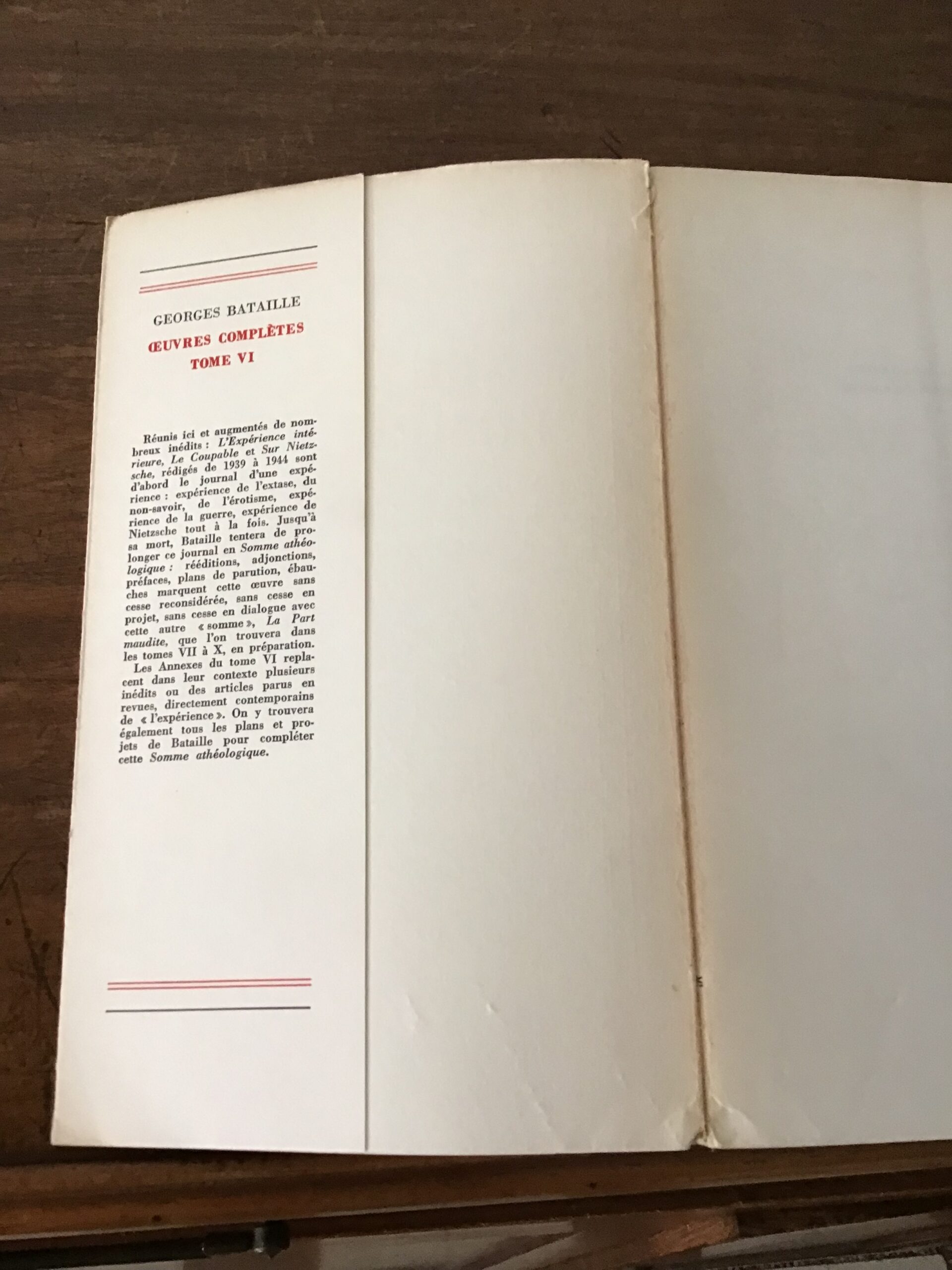 Georges BATAILLE/ tome 6 des oeuvres complètes/ La Somme Athéologique (tome II)/ sur NIETZSCHE, mémorandum, annexes/ Éditions Gallimard 1973