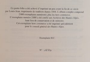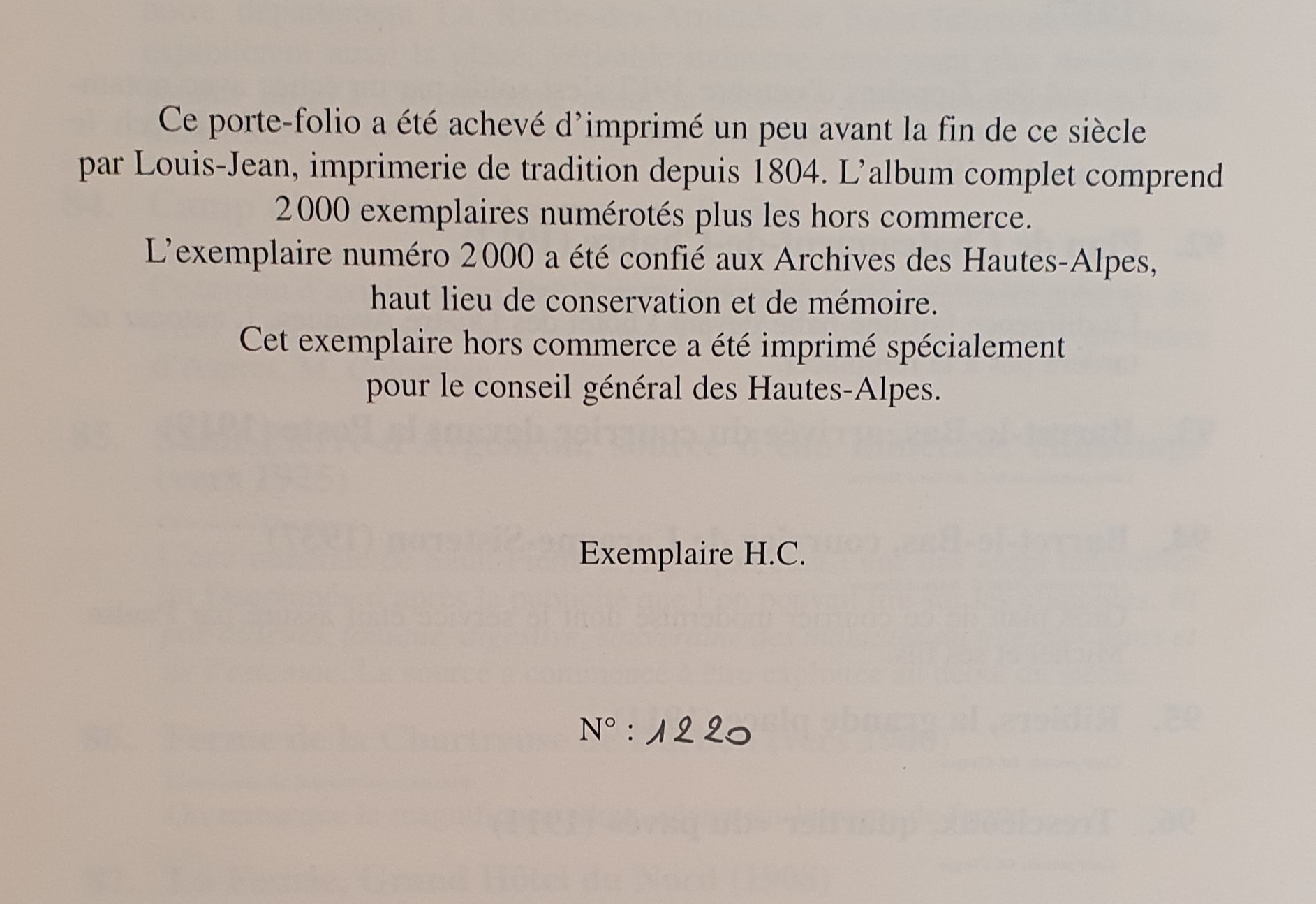 Edition de la librairie des hautes alpes, coffret cartonné in-4 avec illustration noir et blanc, contiens 100 planches port-folio, reproductions photographies noir et blanc, livret de 16 pages agrafés, exemplaire hors commerce numéroté 1220 sur 2000