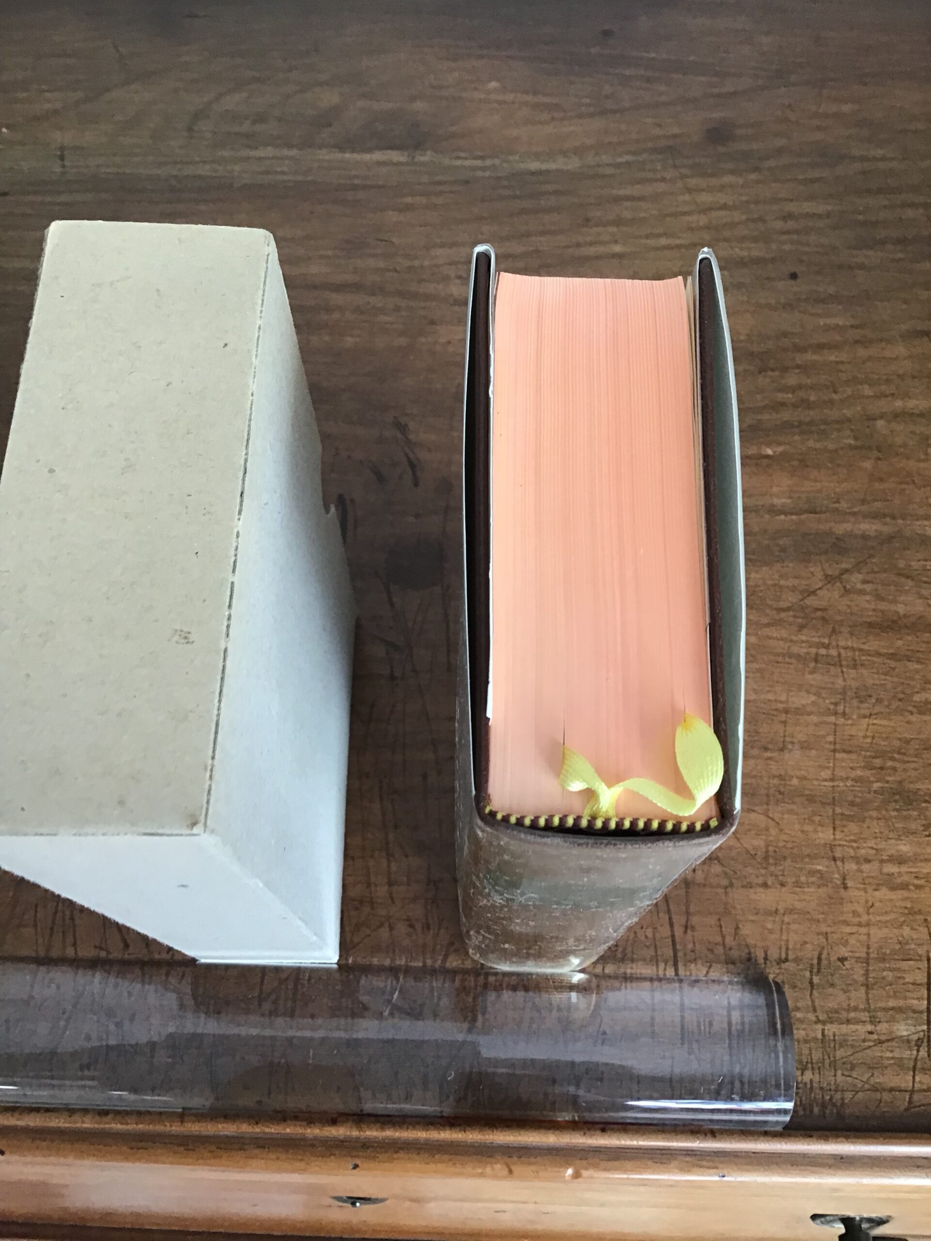Ouvrage relié, imprimé sur papier bible, 2 signets, Rhodoïd, emboîtage en carton brut gris