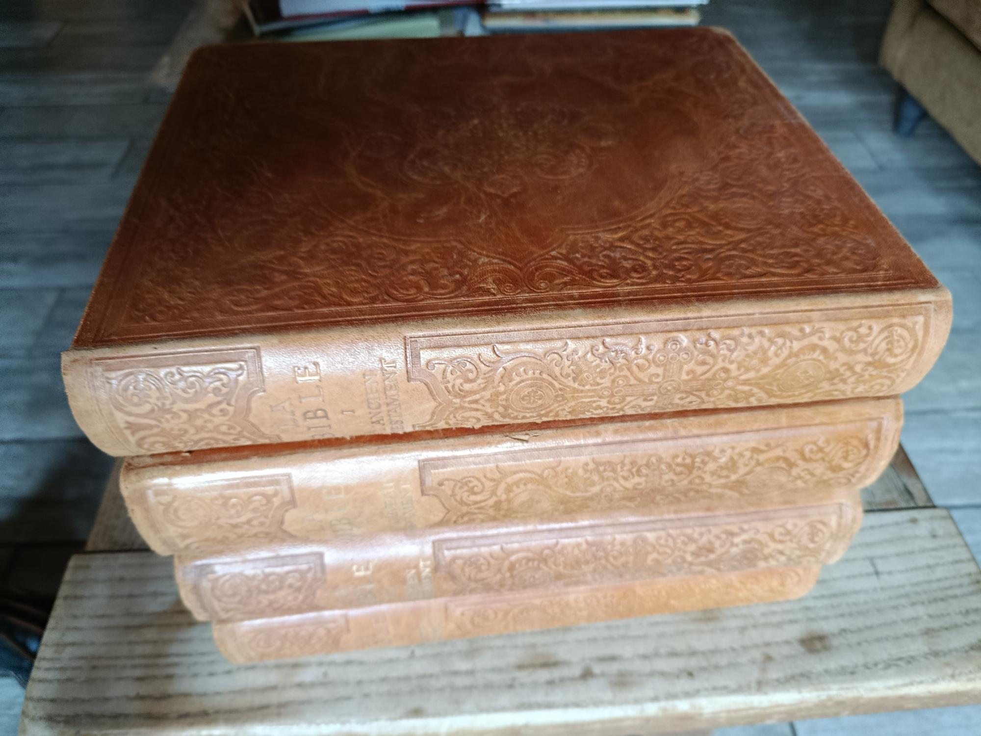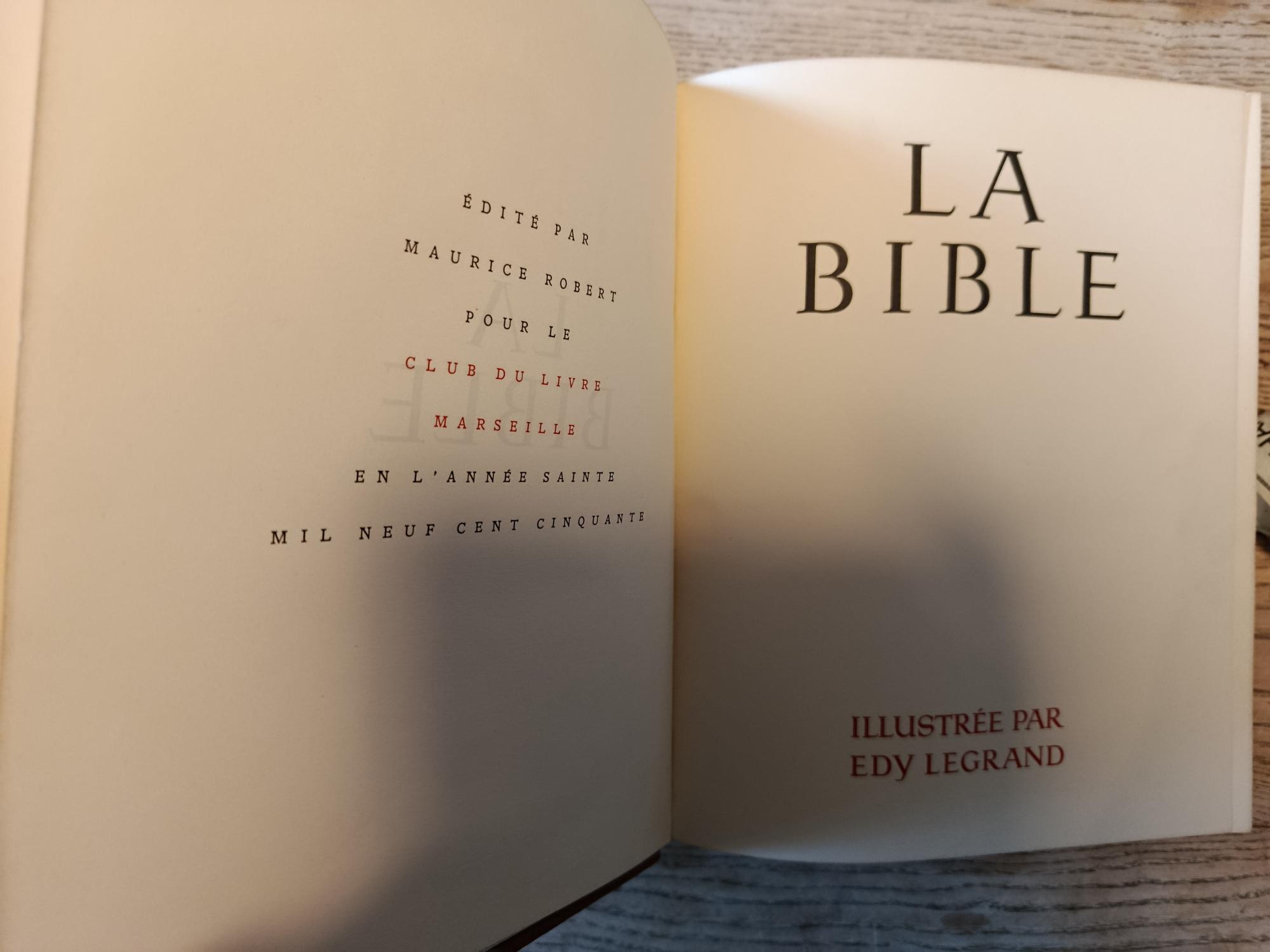1949-1950, Club du livre, in-4 plein cuir havane, pages de garde marbrées, plats gravés, titrages dorés, illustrations noir et blanc pleine page d’Edy Legrand, traduction revue et annotée par Robert Tamisier pour l’ancien testament, traduction et notes de François Amiot, légendes, commentaires et choix de textes par Edy Legrand. Tomes 1, 2 et 3 : Ancien testament, tome 4 : Nouveau testament.