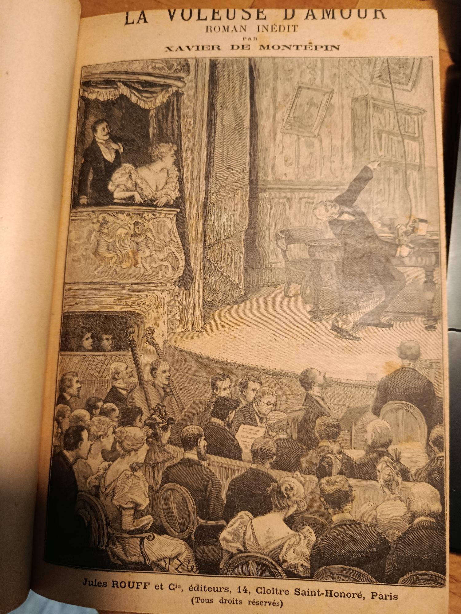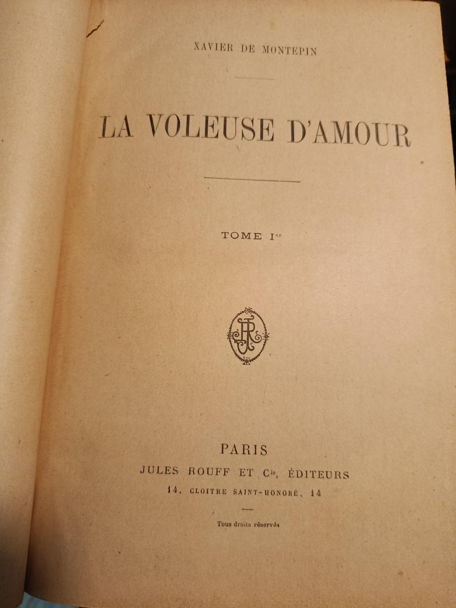 Jules Rouff et Cie, in-4 cartonnés, dos percaline rouge, plats marbrés, La voleuse d’amour, 2 tomes