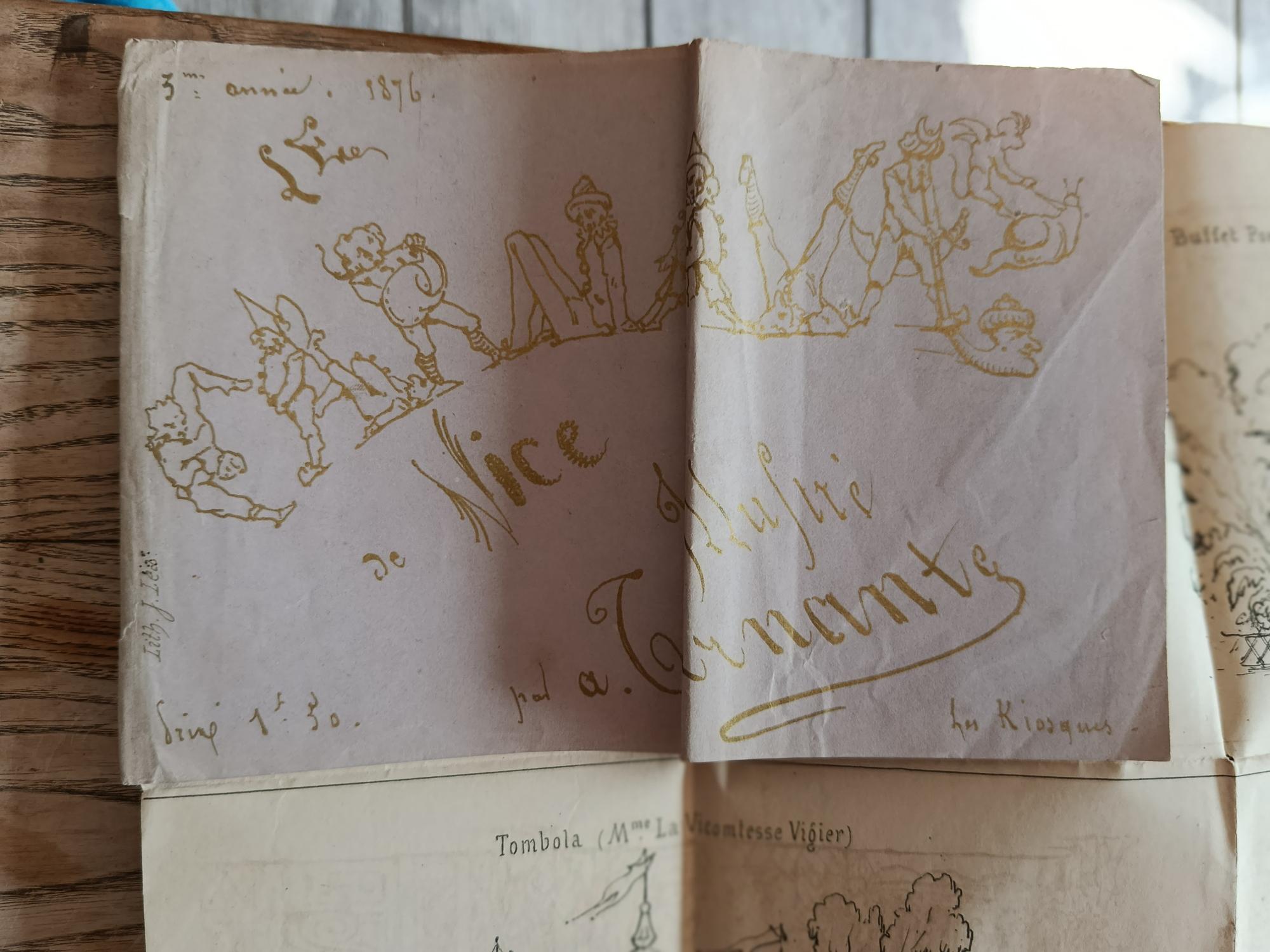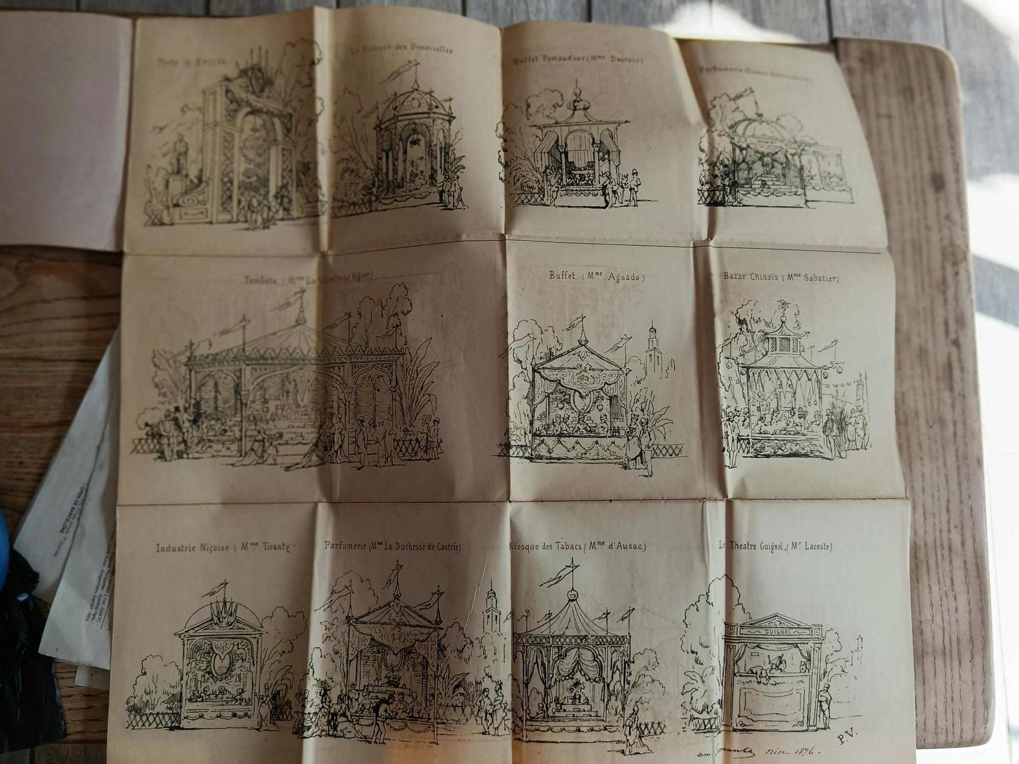 1876, planche pliée au format in-16 oblong, couverture parme illustrée en doré, 11 gravures noir et blanc légendées sur une planche dépliante : porte d’entrée, le kiosque des demoiselles, buffet Pompadour (Mme Decrais), parfumerie (Dames Américaines), Tombola (Mme La Vicomtesse Vigier), buffet (Mme Aguado), bazar chinois (Mme Sabatier), industrie niçoise (Mme Tiranty), parfumerie (Mme la duchesse de Castrie), kiosque des tabacs (Mme d’Ausac), le théâtre guignol (M.Lacoste). Lith. J.Led.