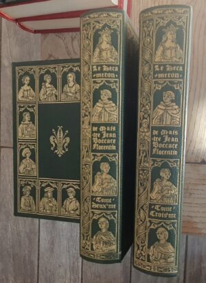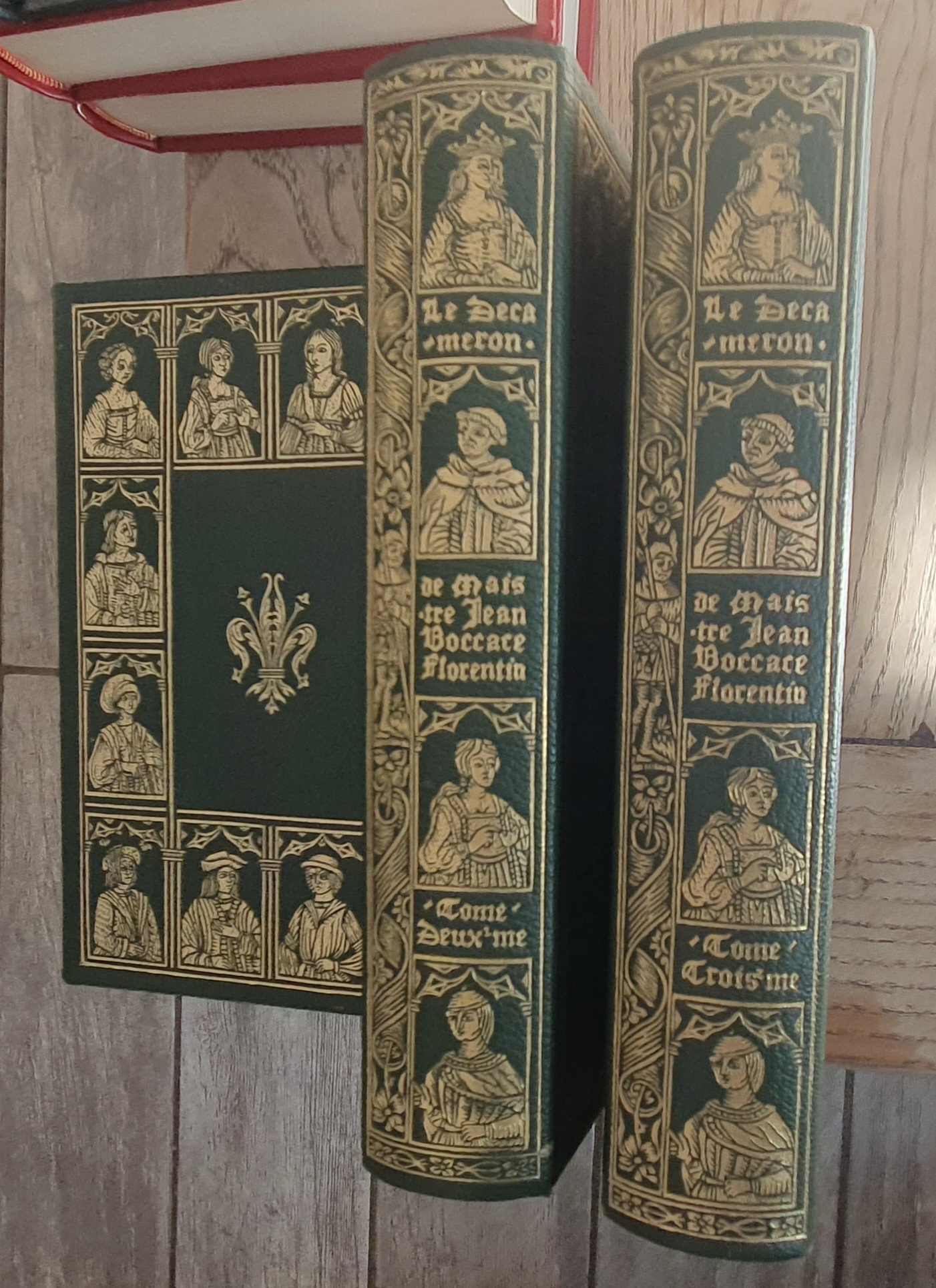 1971, Jean de Bonnot, in-8 plein cuir vert de 342 + 308 + 292 pages, titrages, têtes et plats ornés dorés, Les contes autrement nommés Le Décaméron de Maistre Jean Boccace Florentin, 237 bois anciens noir et blanc, traduit de l’italien par Antoine Sabatier (dit Sabatier de Castres)