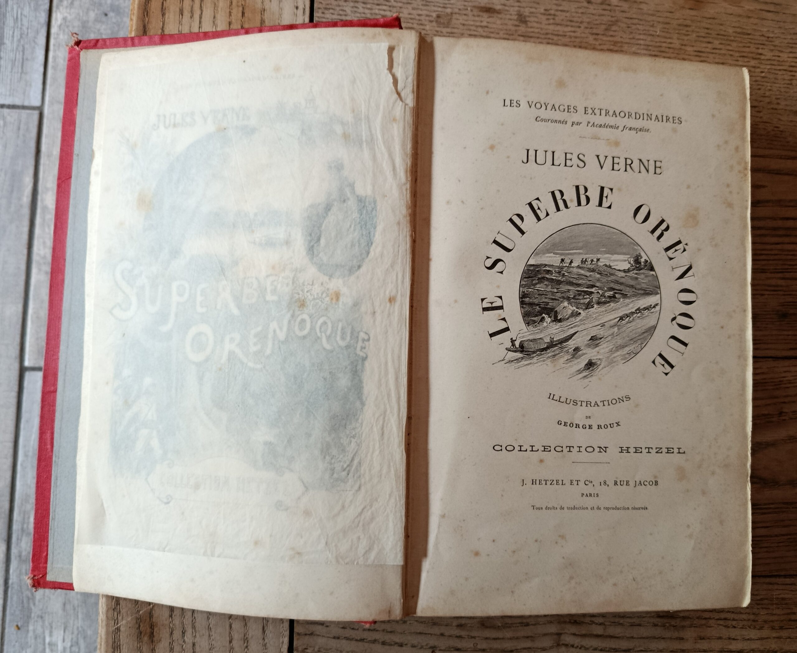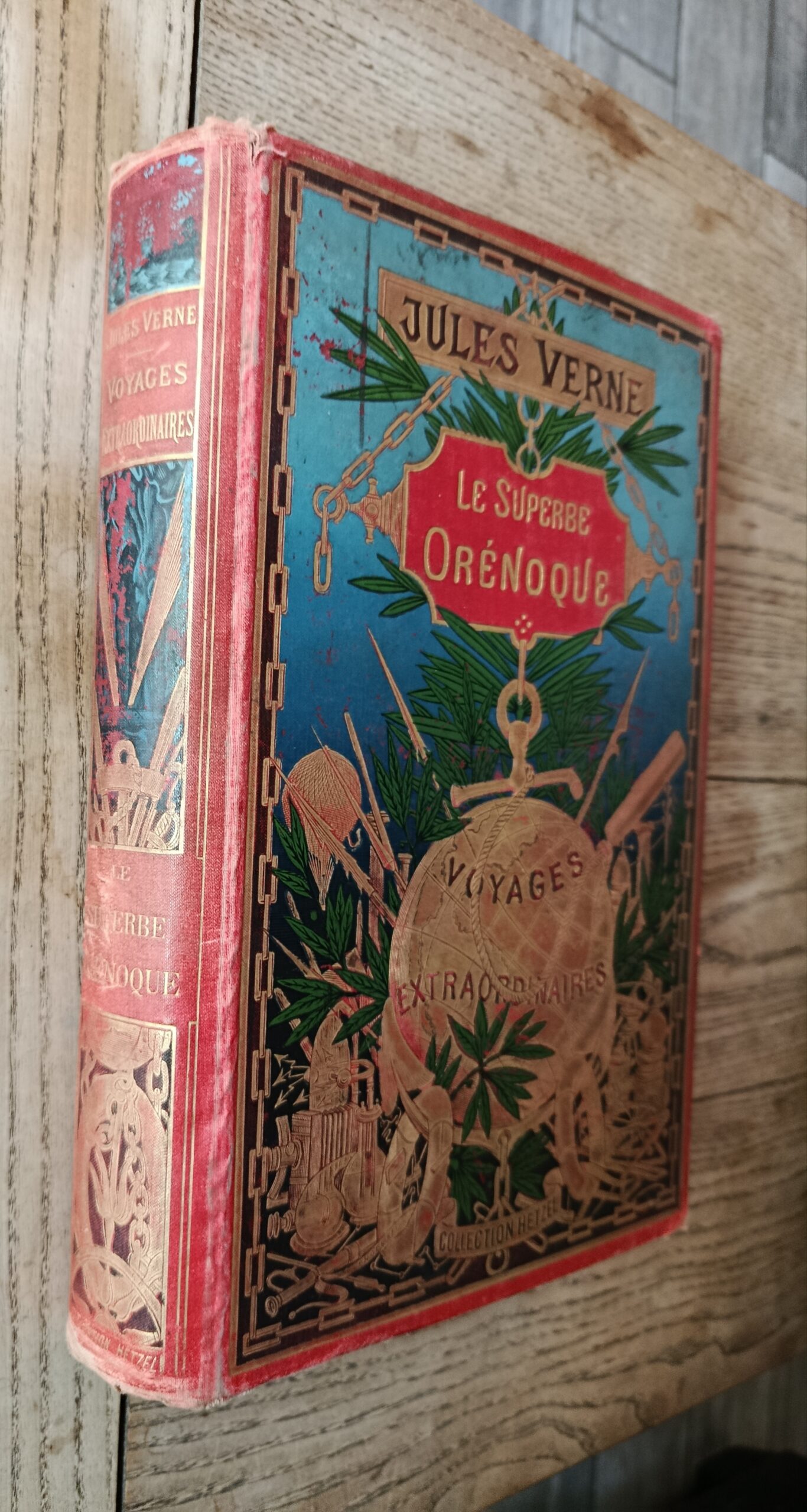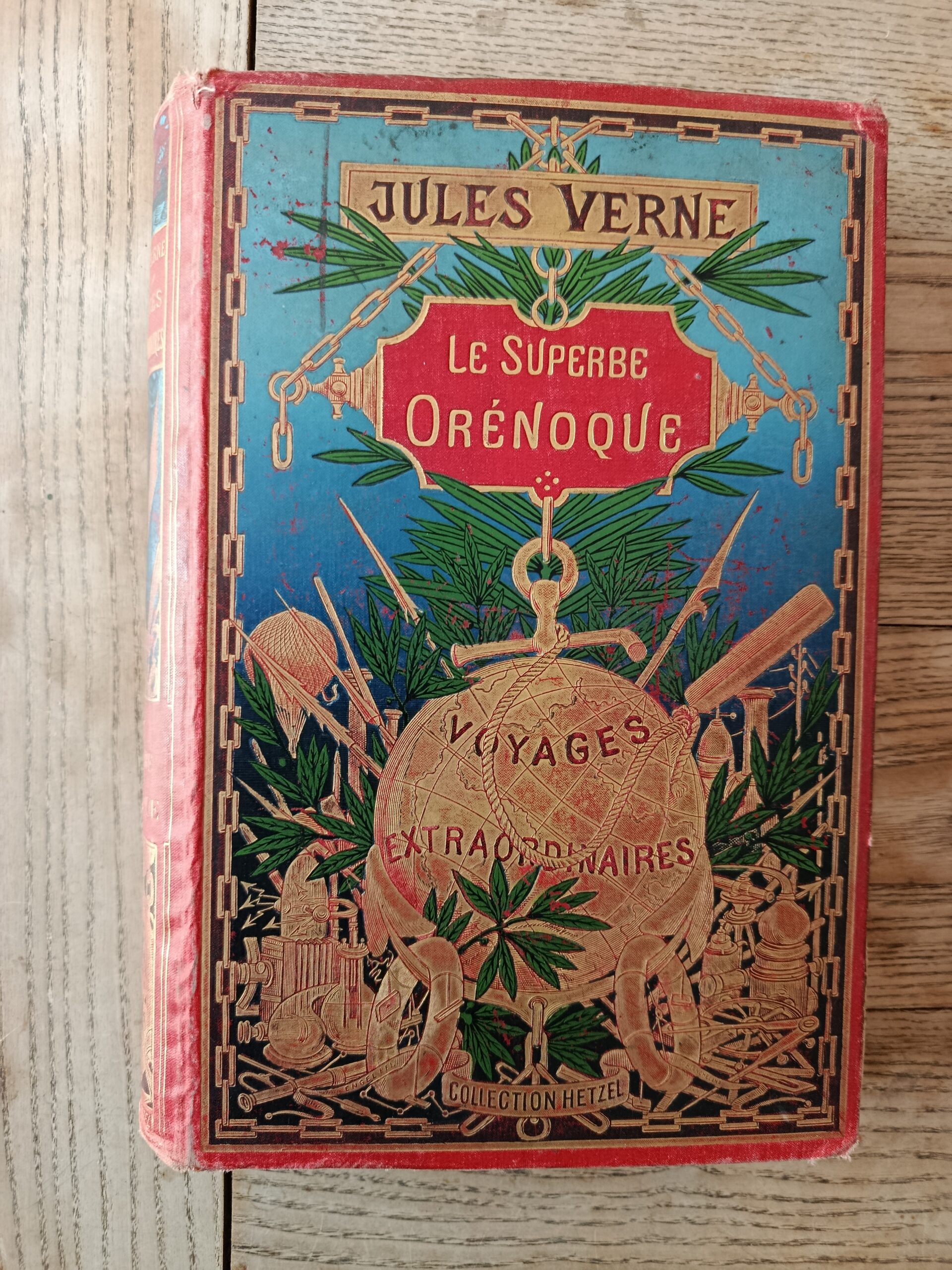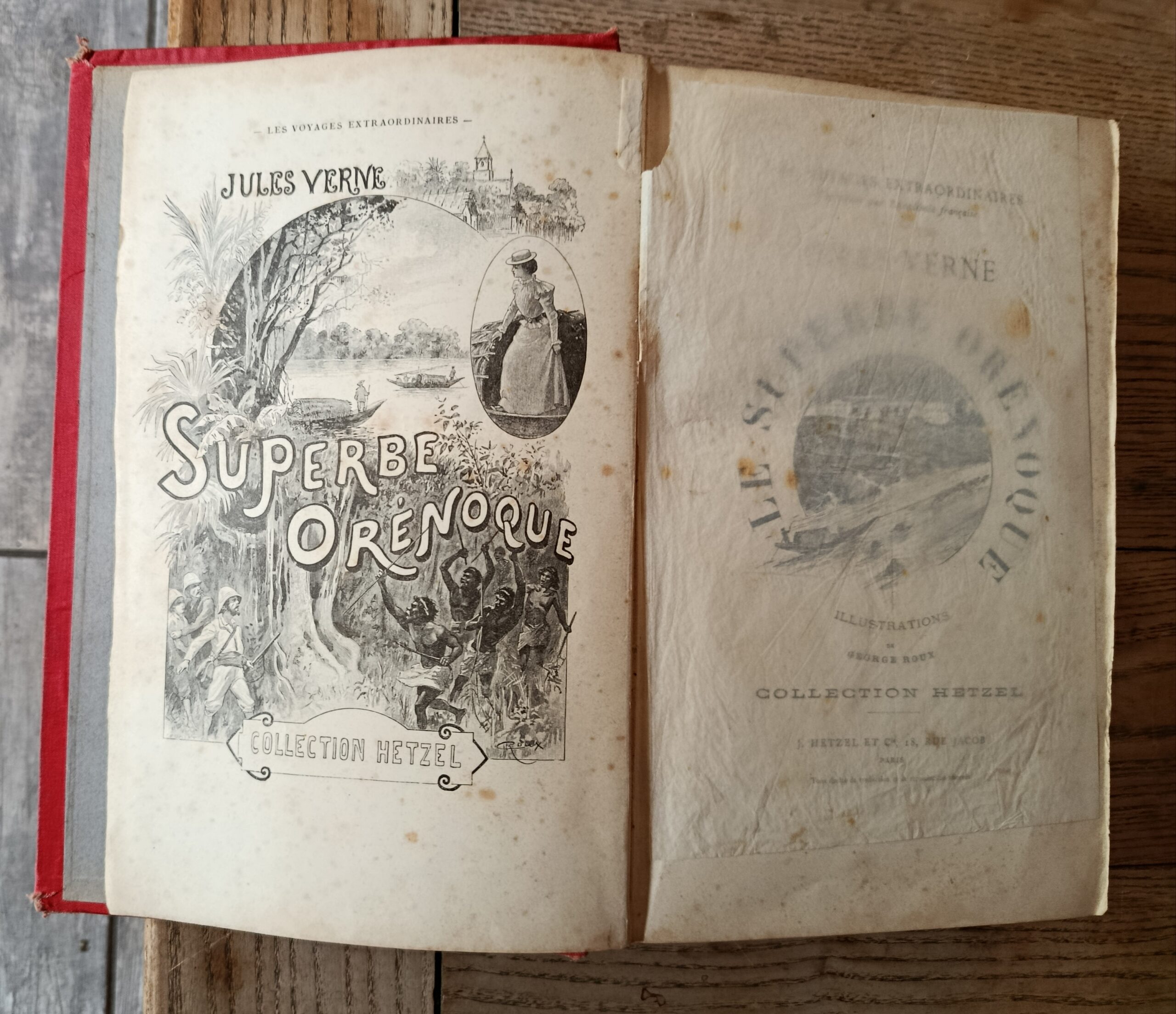 1898, Hetzel, in-4 reliure éditeur percaline rouge, cartonnage dit type à la mappemonde, tranches dorées, illustrations de G. Roux. Édition originale. exemplaire à restaurer