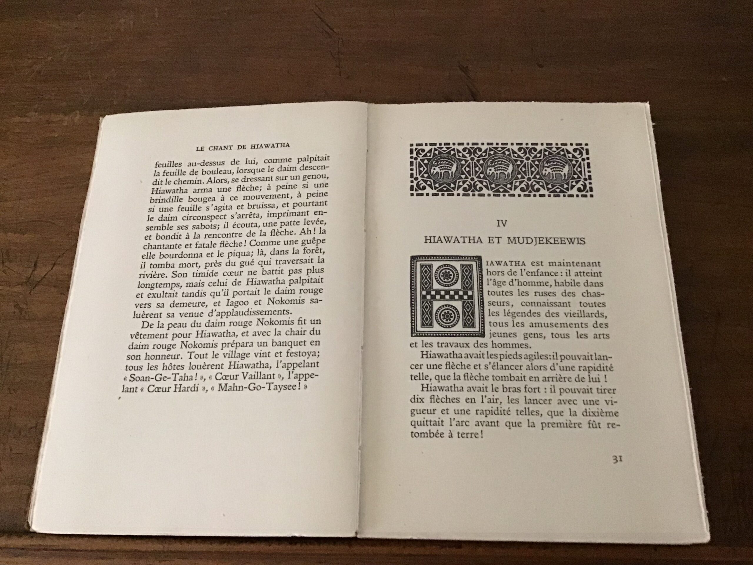 M. RICHARD/ Le Chant de HAWATHA d’après les légendes Peaux-Rouges recueillies par H.-W. LONGFELLOW/ Ornementation dessinée par H.SWORYKINE/ Collection « Épopées et Légendes »/ L’édition d’Art H.PIAZZA/ troisième édition de 1927