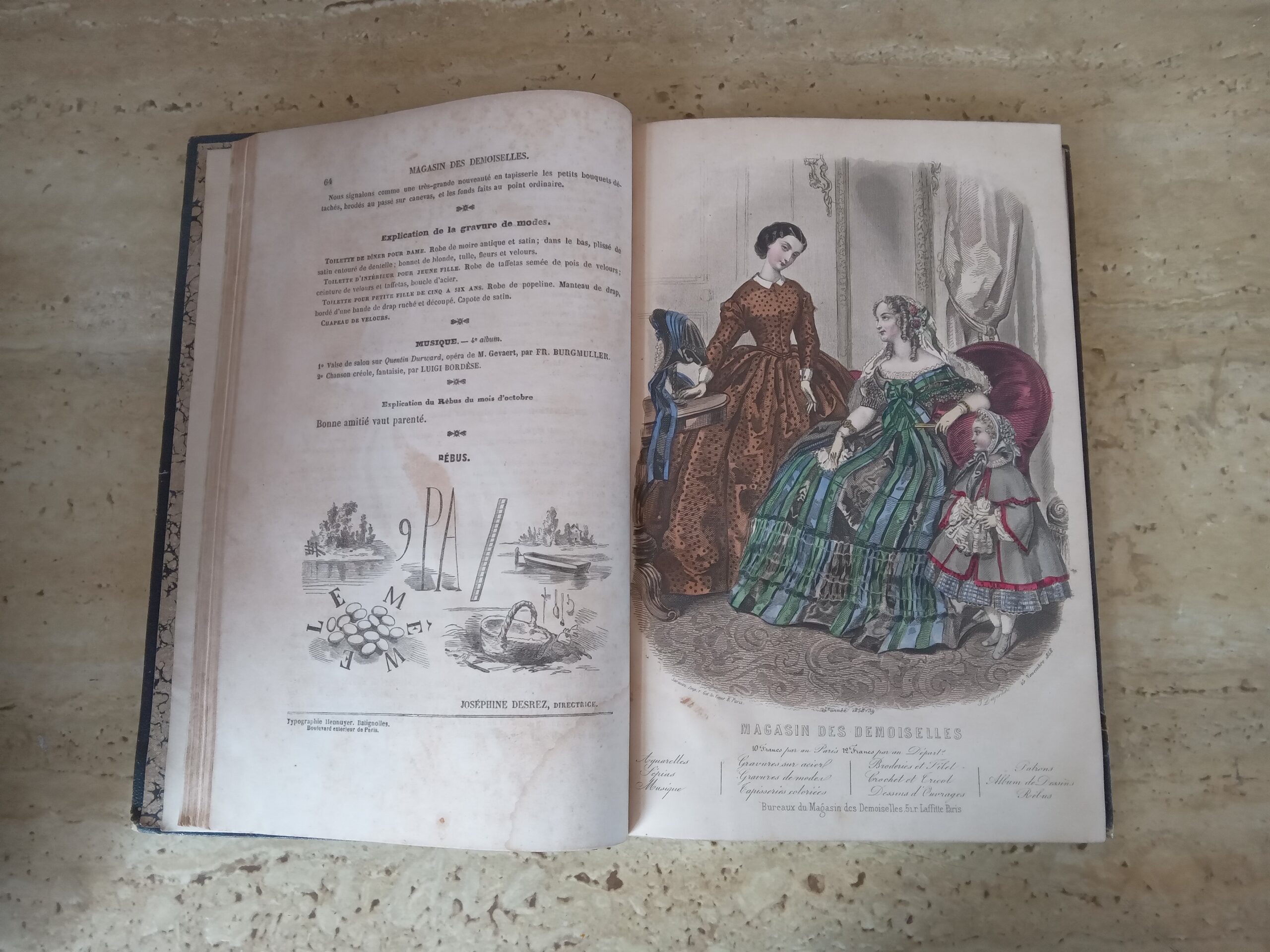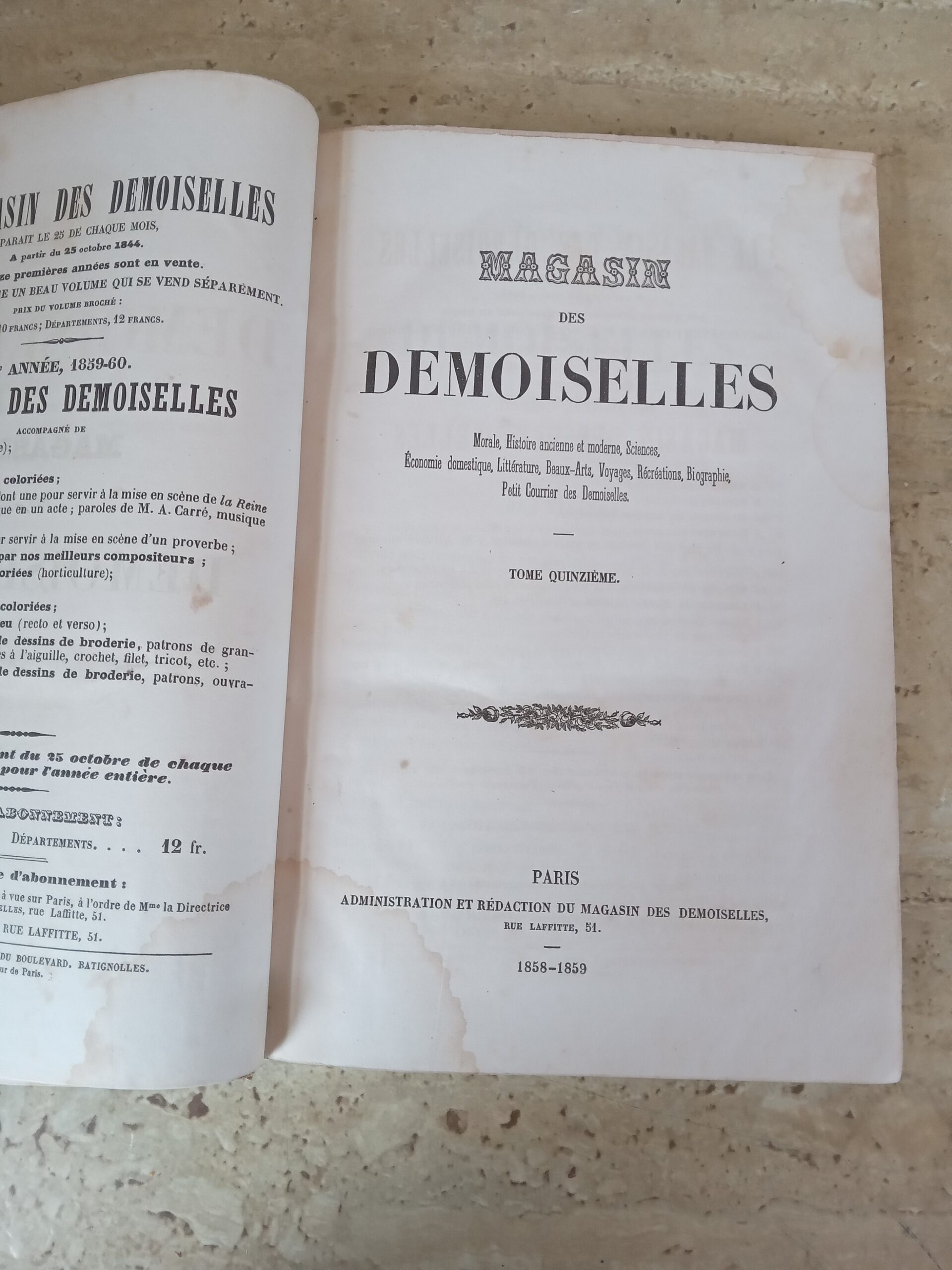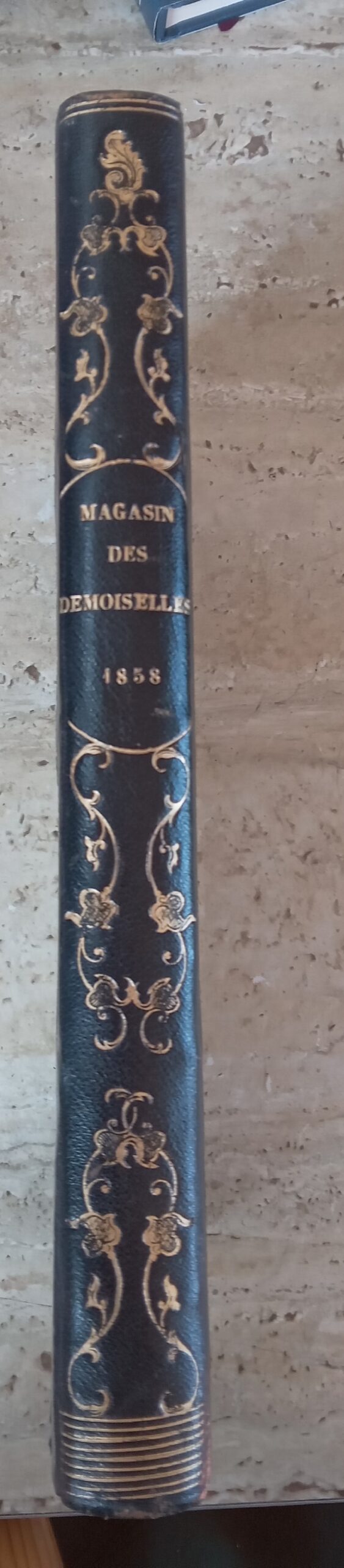 1858-1859, Administration et rédaction du magasin des Demoiselles, in-4 demi-cuir de 378 pages, titrage doré, gardes marbrées, nombreuses gravures couleurs hors-texte et noir et blanc in-texte. Morale, histoire ancienne et moderne, sciences, économie domestique, littérature, beaux-arts, voyages, récréations, biographie, petit courrier des demoiselles.