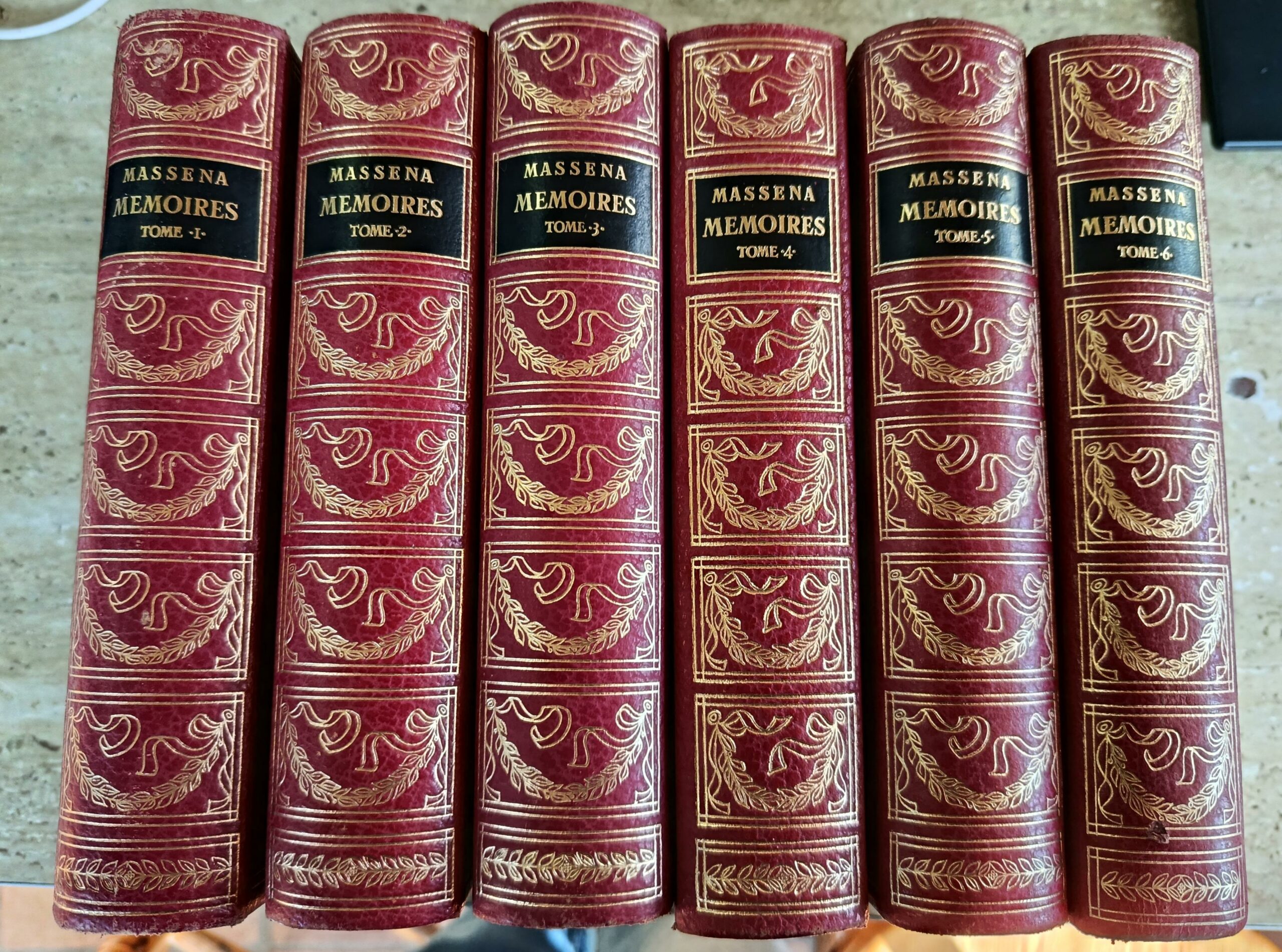 1966, Jean de Bonnot, in-8 plein cuir bordeaux, titrages et têtes dorés, plats ornés de fers dorés, signets. Masséna, duc de Rivoli, prince d’Essling, maréchal d’empire, rédigés d’après les documents qu’il a laissés et sur ceux du dépôt des fortifications recueillis par le Général Koch.