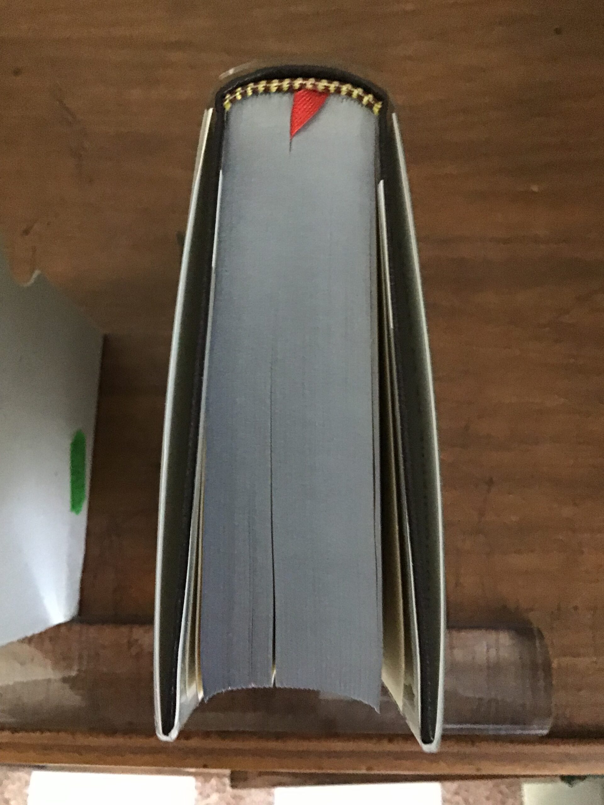 Ouvrage relié en pleine peau dorée à l’or fin 23 carats, imprimé sur papier bible, 2 signets, Rhodoïd, emboîtage en carton brut gris