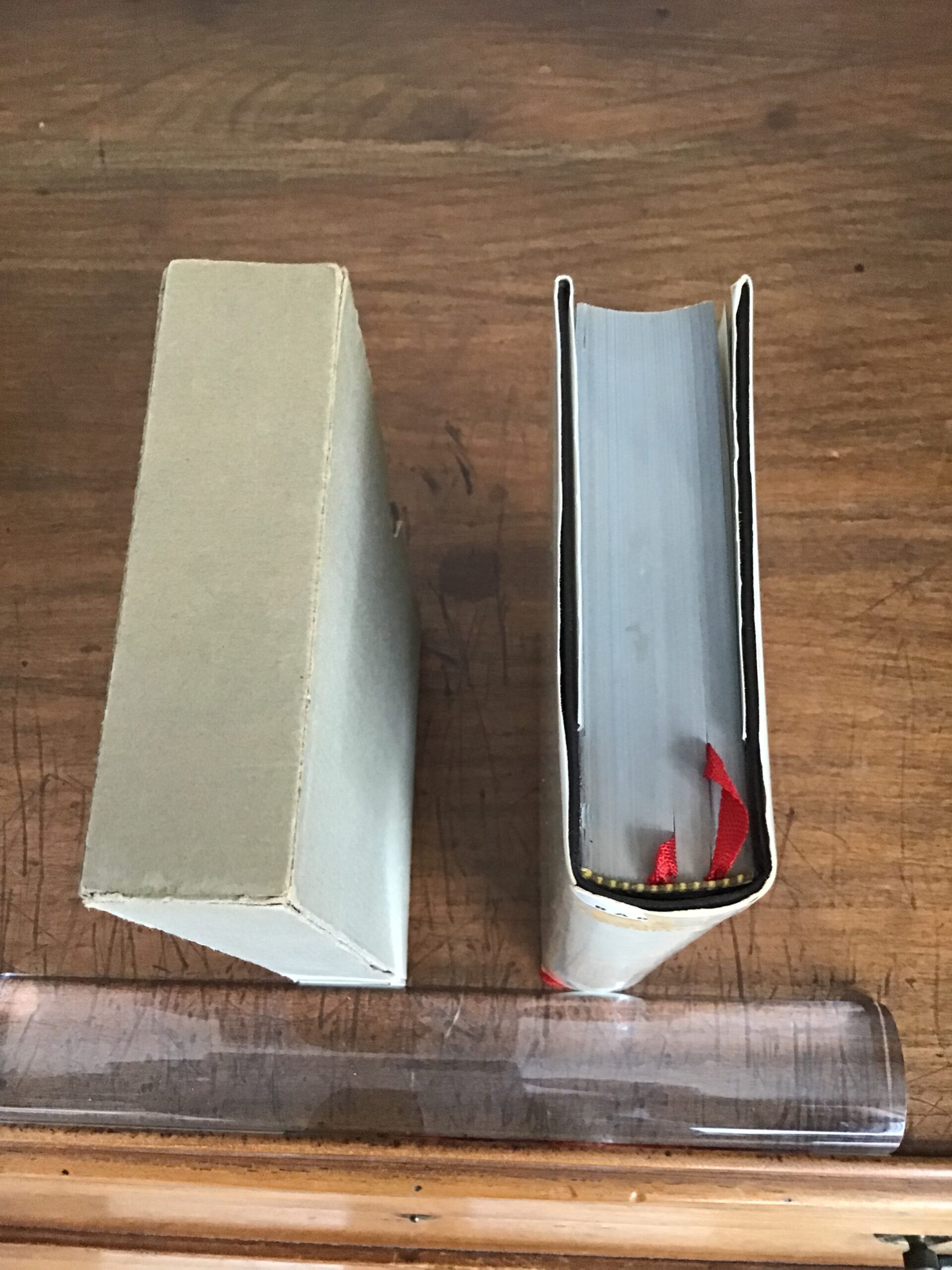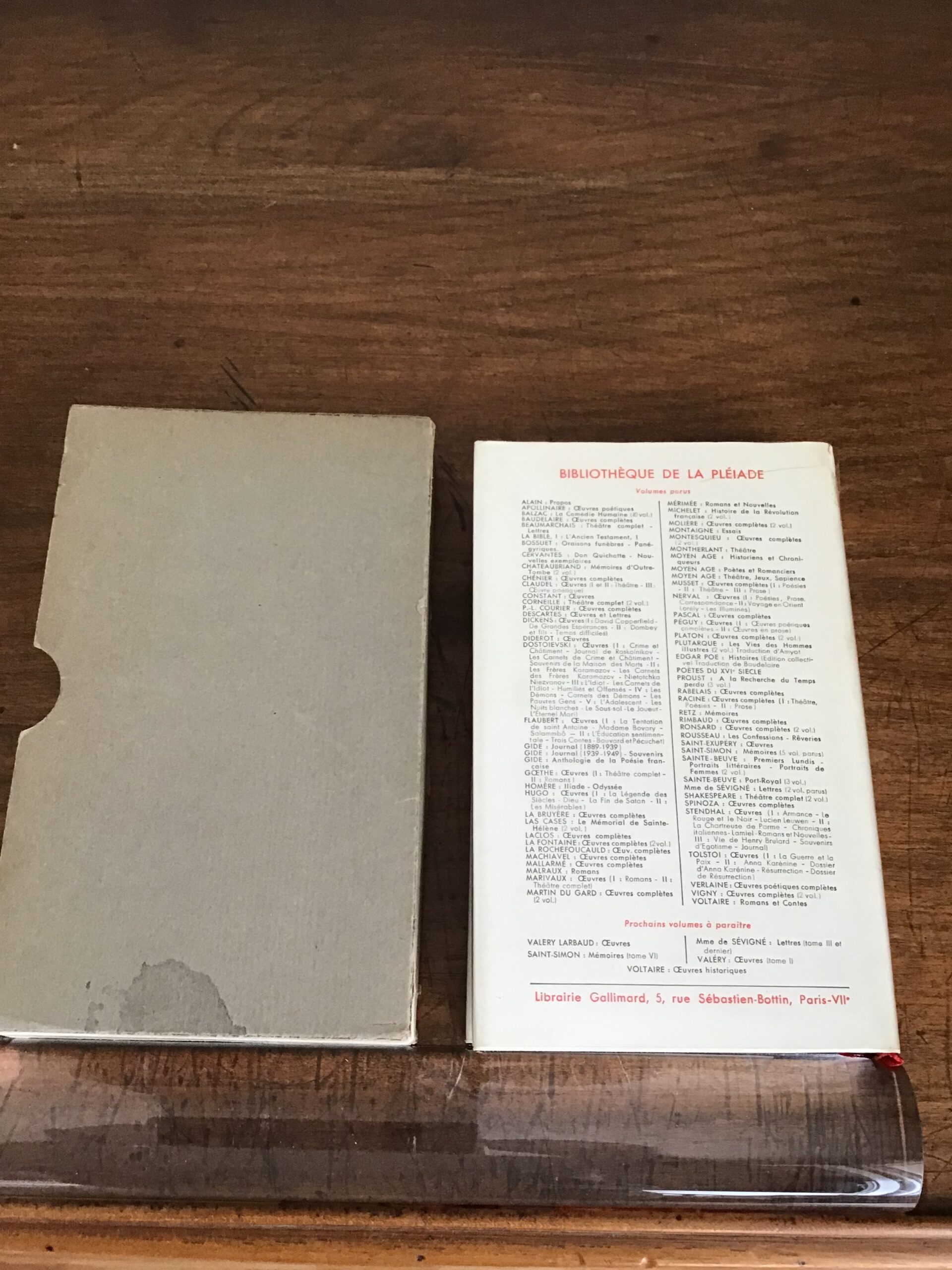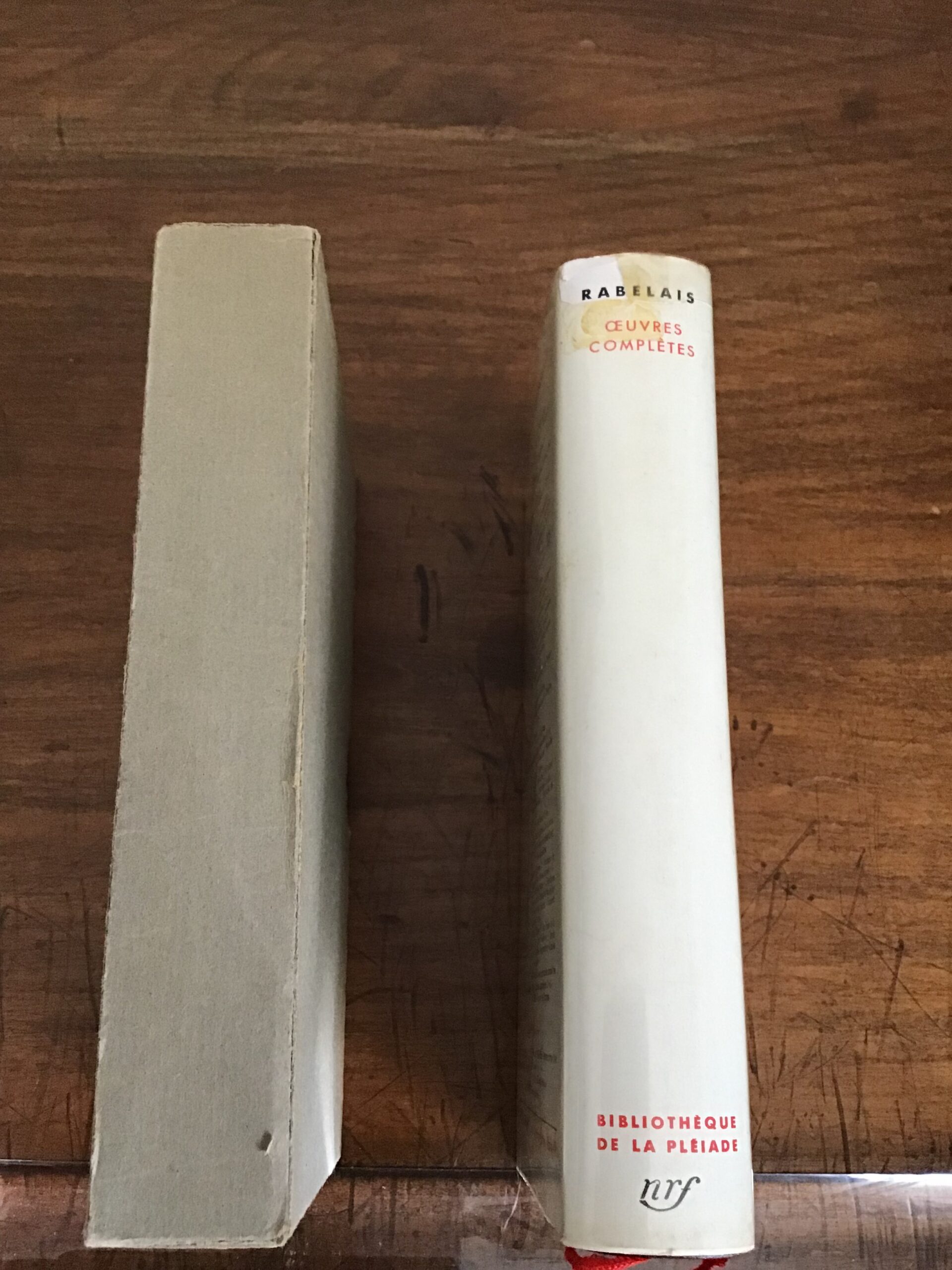 Ouvrage imprimé sur papier bible, 2 signets, ni jaquette, ni Rhodoïd, emboîtage en carton brut gris (tâché)