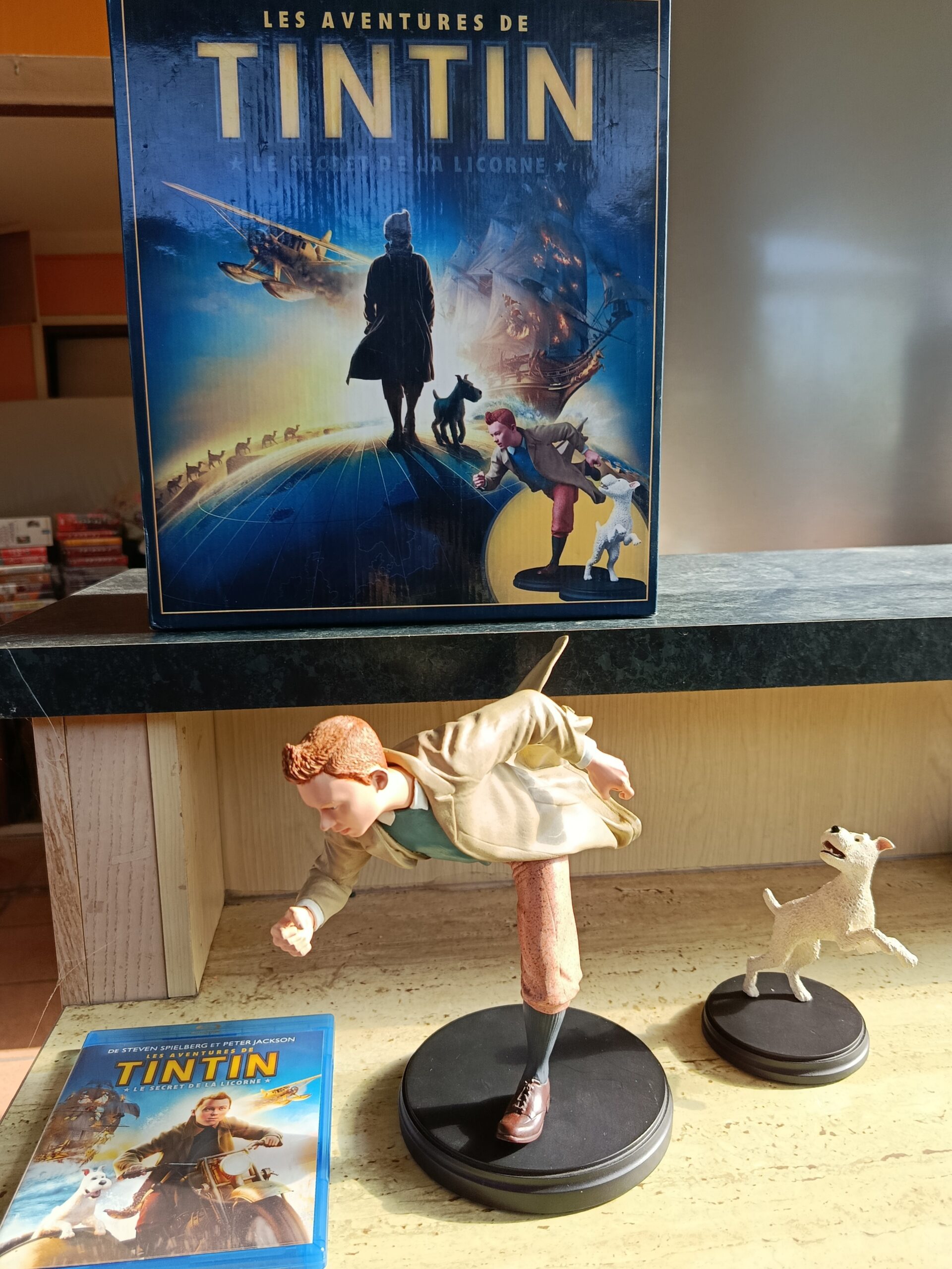 Coffret cartonné in-folio avec Blu-ray, DVD et deux figurines de Tintin et Milou. A retirer sur place , pas d’expédition