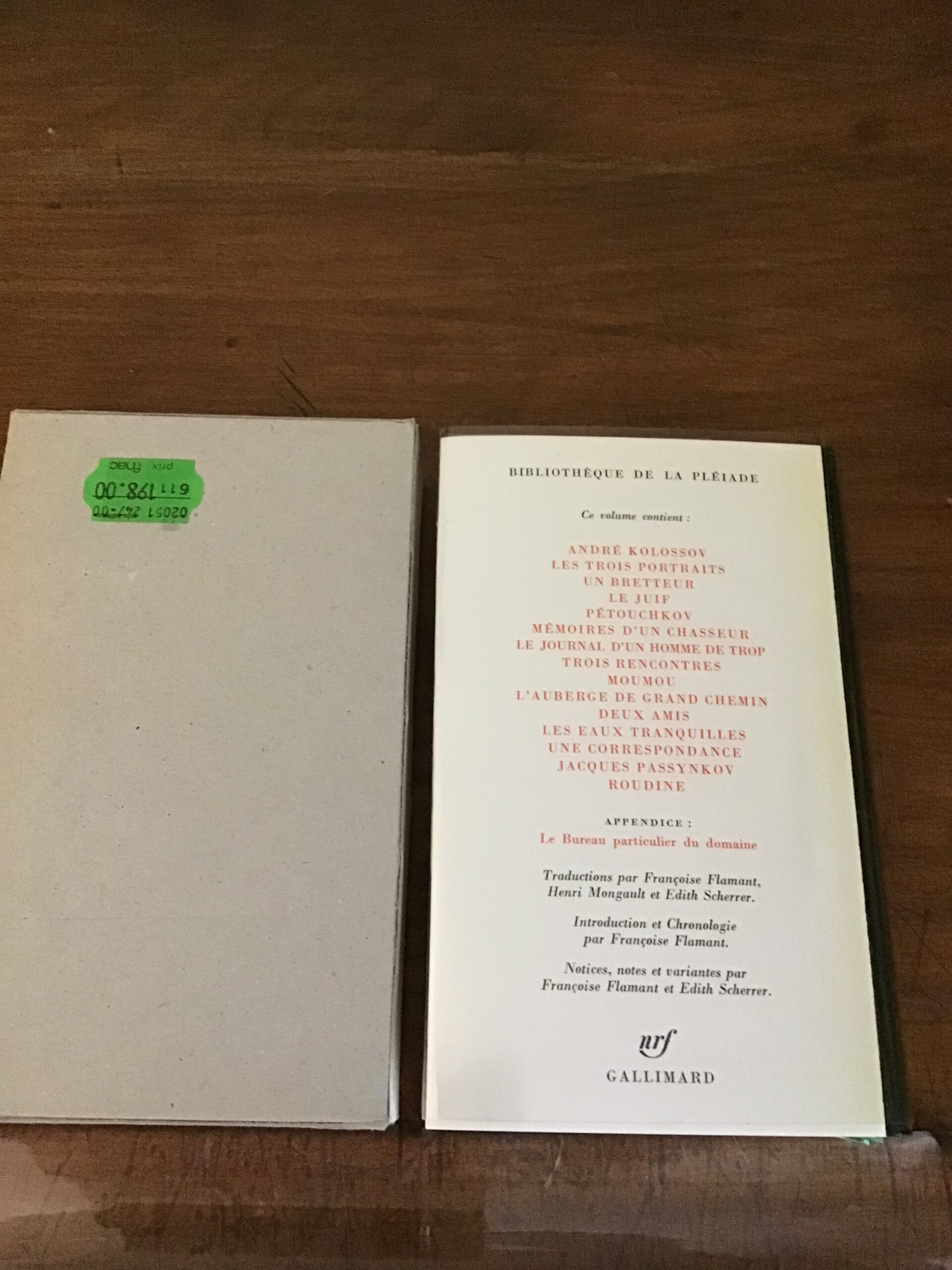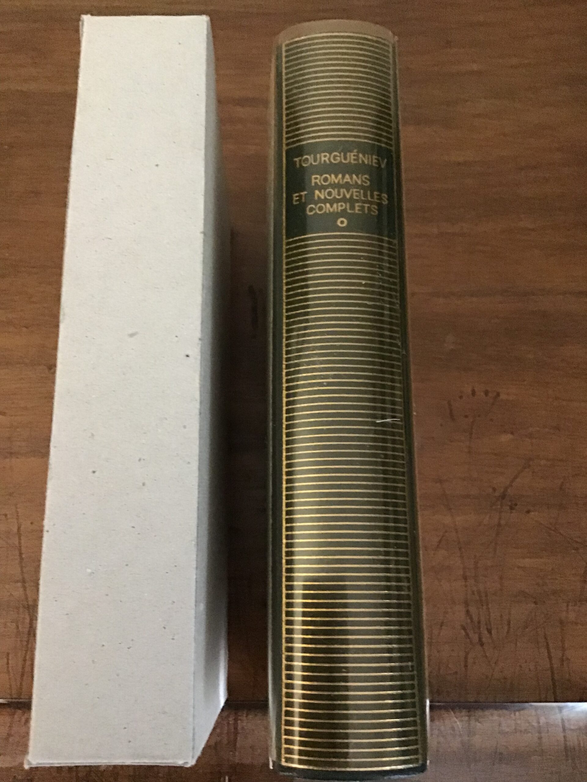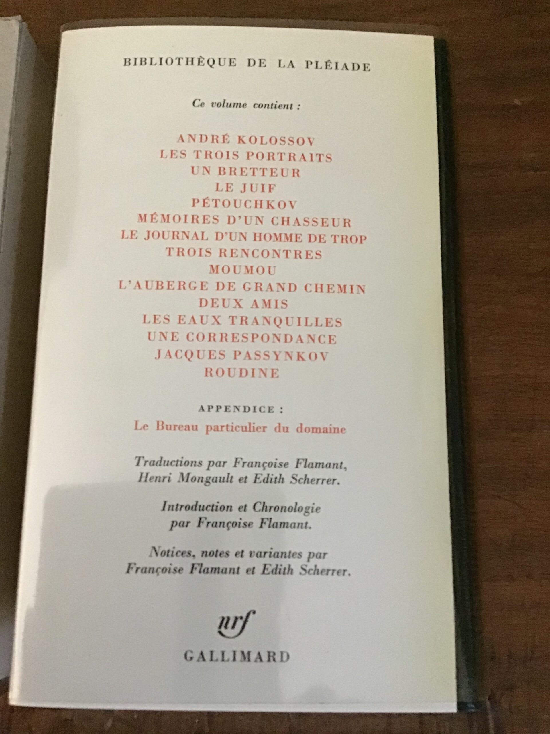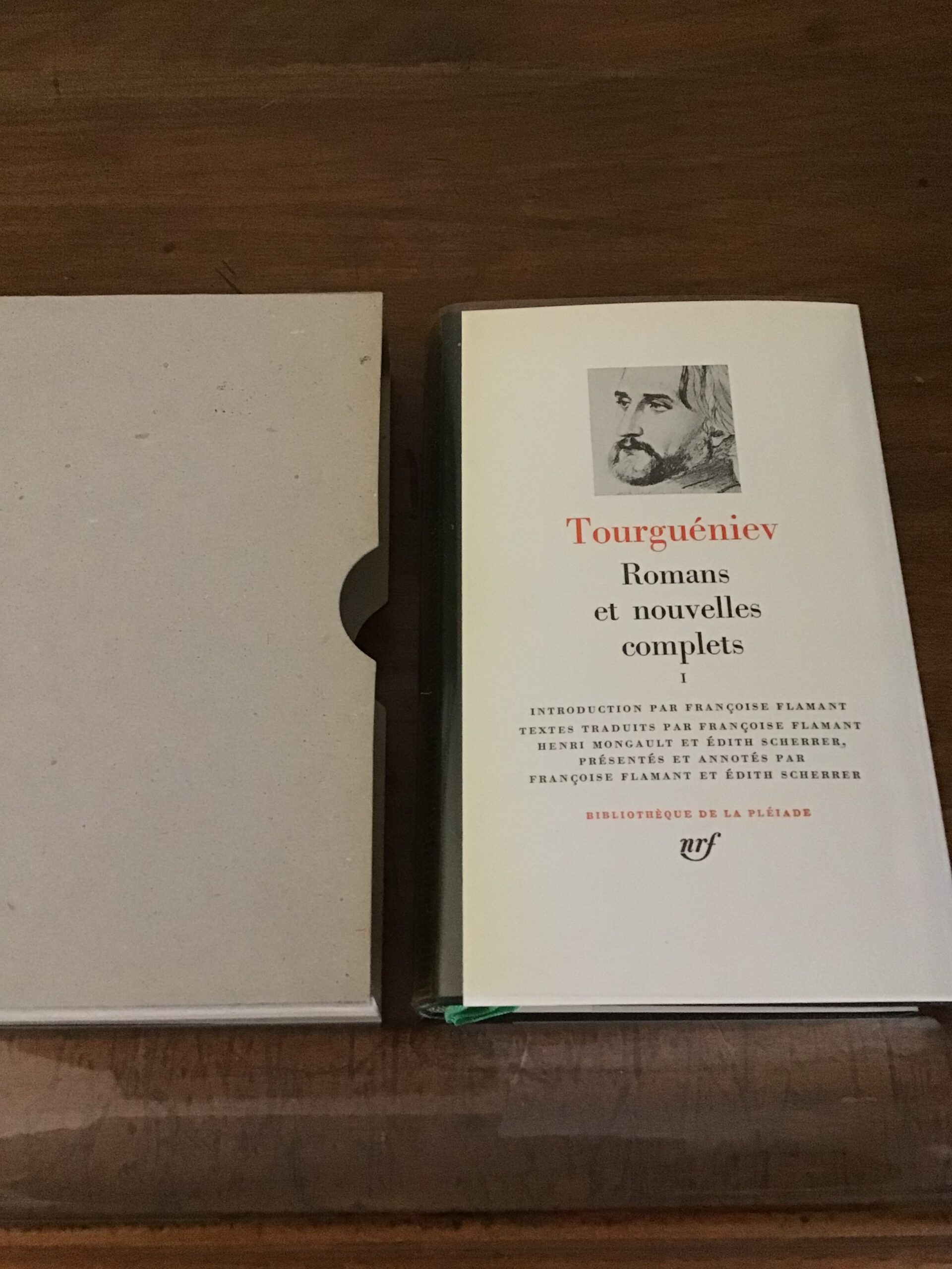 TOURGUÉNIEV/ Romans et Nouvelles complets I / Introduction par Françoise FLAMANT/ Textes traduits par Françoise FLAMANT, Henri MONGAULT et Édith SCHERRER, présentés et annotés par Françoise FLAMANT et Édith SCHERRER/ Volume 289 de la « Bibliothèque de la Pléiade »/ Éditions NRF GALLIMARD/ édition de 1981, impression de 1981.