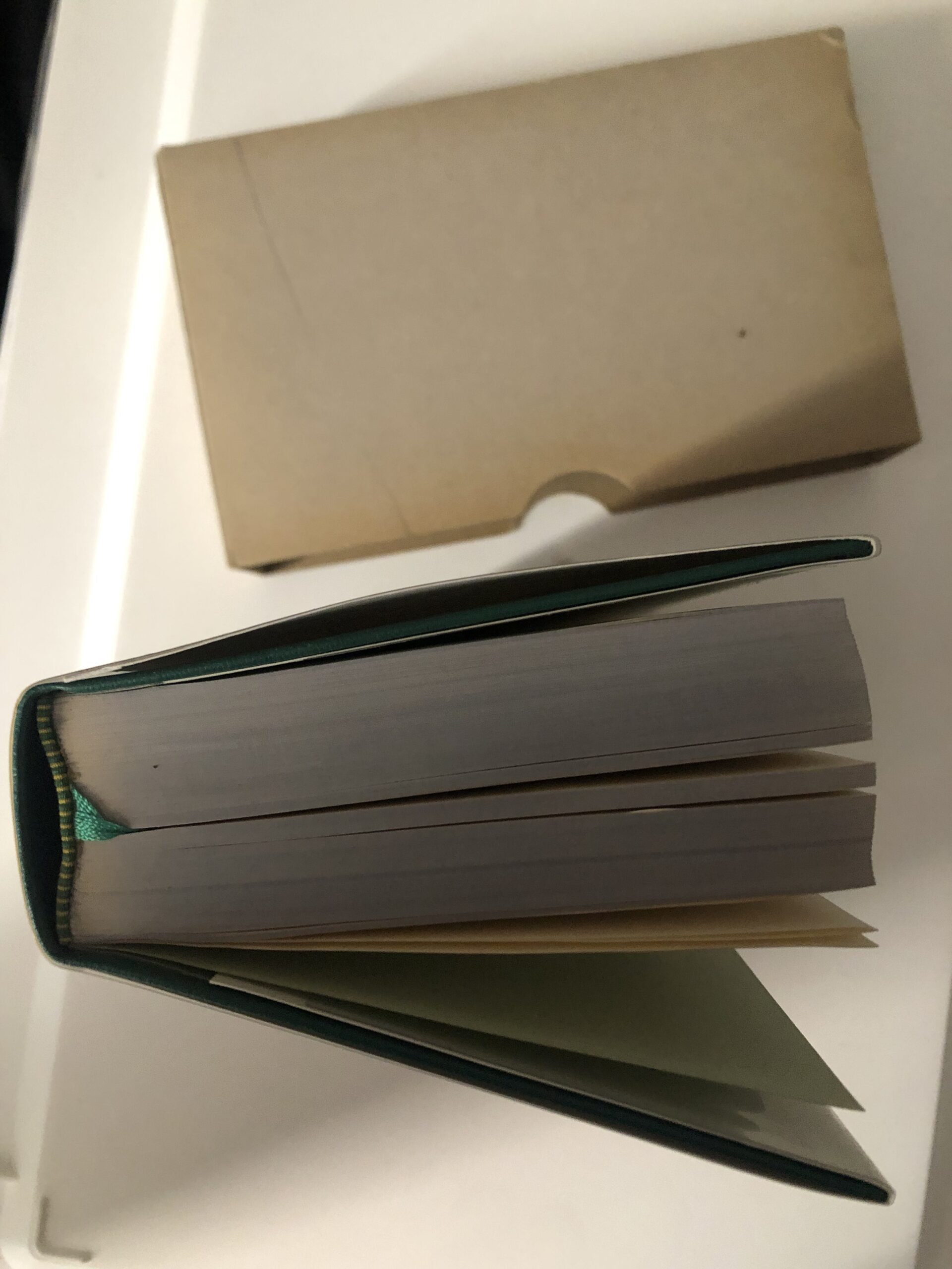 Ouvrage relié, imprimé sur papier bible, 2 signets, Rhodoïd, emboîtage en carton brut